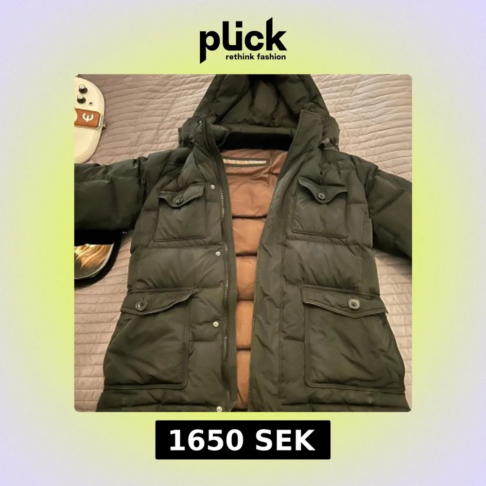 Säljer en svart dunjacka från Hetregó med huva och flera praktiska fickor med knappar. Jackan har en dragkedja framtill och är perfekt för kalla dagar. Den är quiltad för extra värme och komfort. Passar S & M