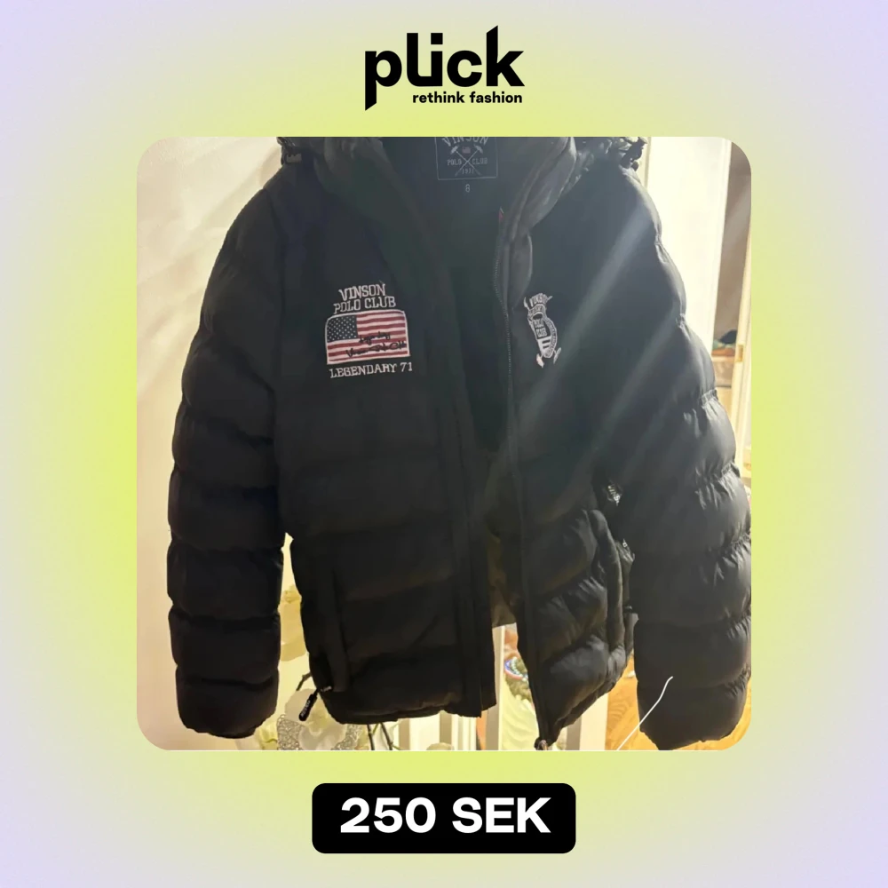 Säljer en svart pufferjacka från Vinson Polo Club i mycket bra skick. Jackan har broderade detaljer med amerikansk flagga och texten 'Legendary 71'. Den är perfekt för vintern med sin varma och vadderade design. Dragkedja framtill och justerbara snören i nederkant för bästa passform.