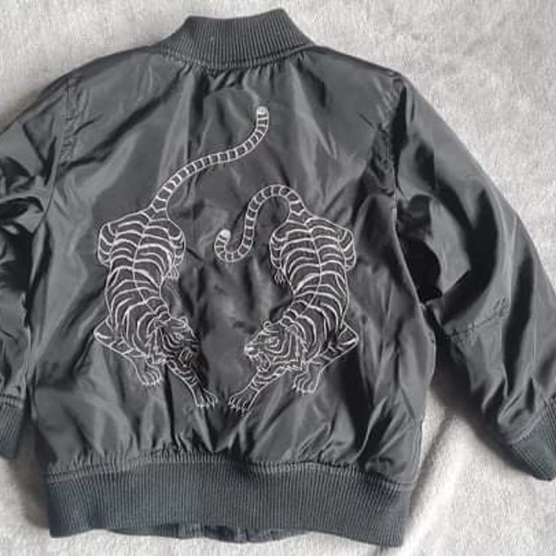 En svart bombarjacka med motiv på ryggen. I gott skick strl 98