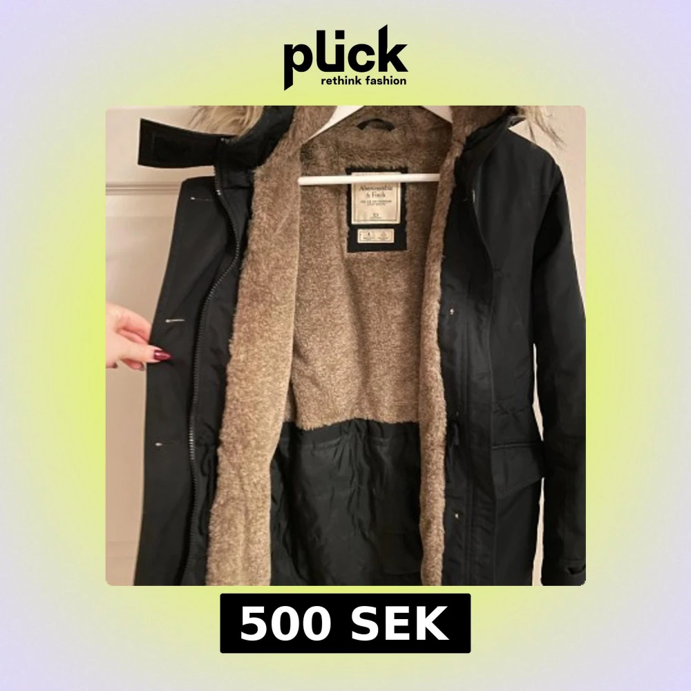 Svart parkajacka/vinterjacka från Abercrombie & Fitch med fluffig beige fuskpäls i huvan och insidan. Jackan har dragkedja, snörning i midjan och stora fickor framtill. Perfekt för kalla dagar med sin varma och mysiga känsla. Snygg detalj med logga på ärmen.