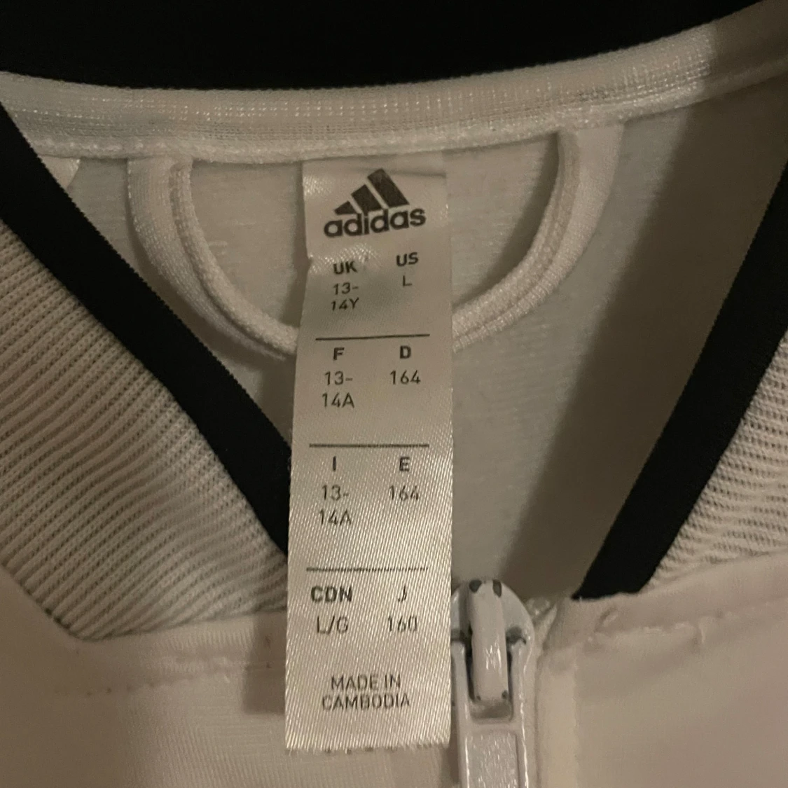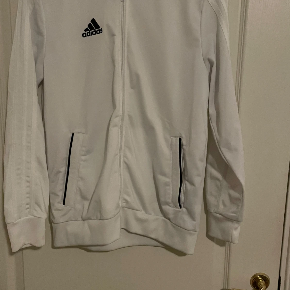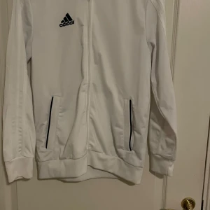 Säljer en stilren vit träningsjacka från Adidas med dragkedja och svarta detaljer. Jackan har långa ärmar och två fickor framtill. Perfekt för sportiga aktiviteter eller som en snygg vardagsjacka.