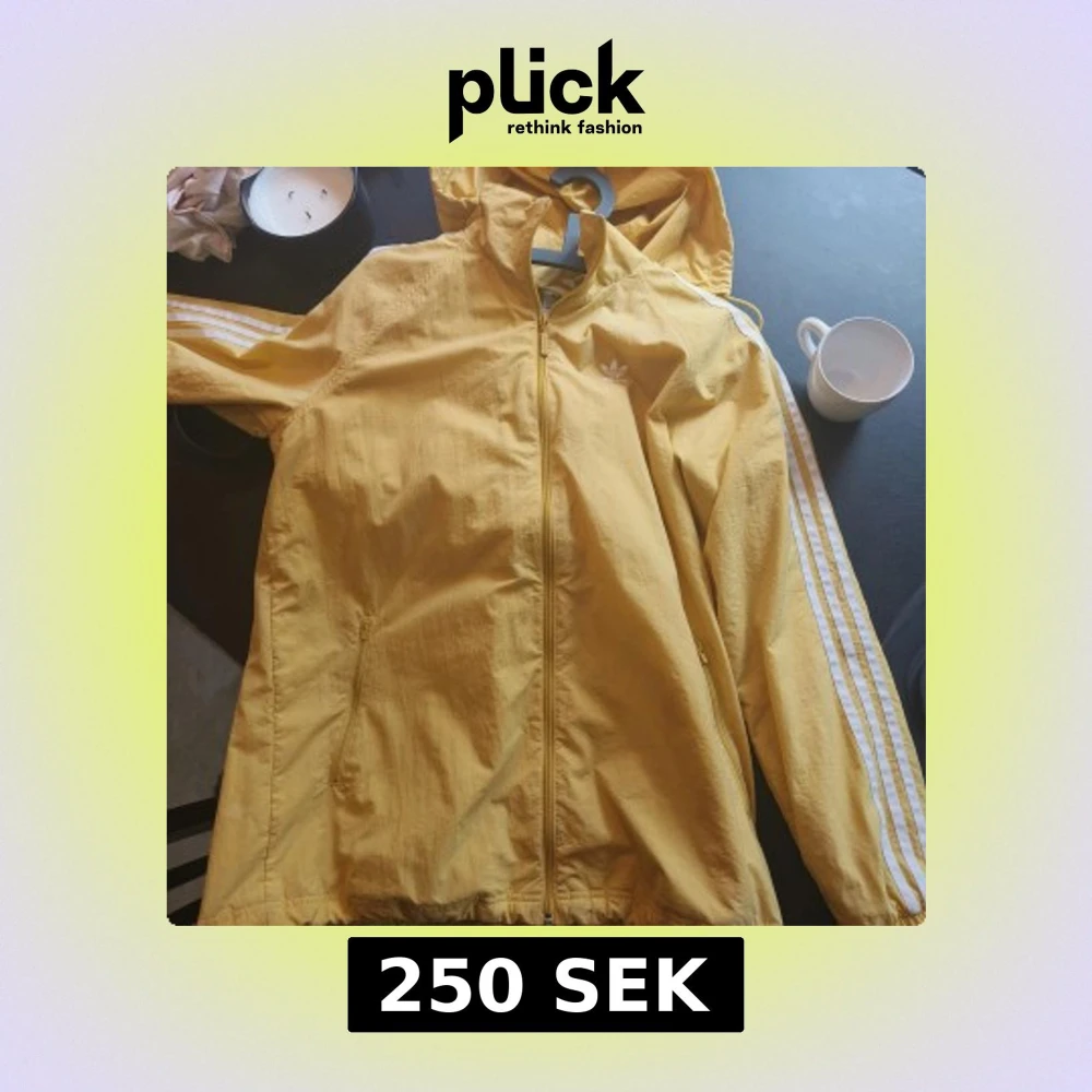 Snygg gul vindjacka från Adidas med klassiska vita ränder längs ärmarna och vit logga på bröstet. Jackan har dragkedja framtill, två fickor och en praktisk huva. Perfekt för dig som gillar sportig och avslappnad stil.