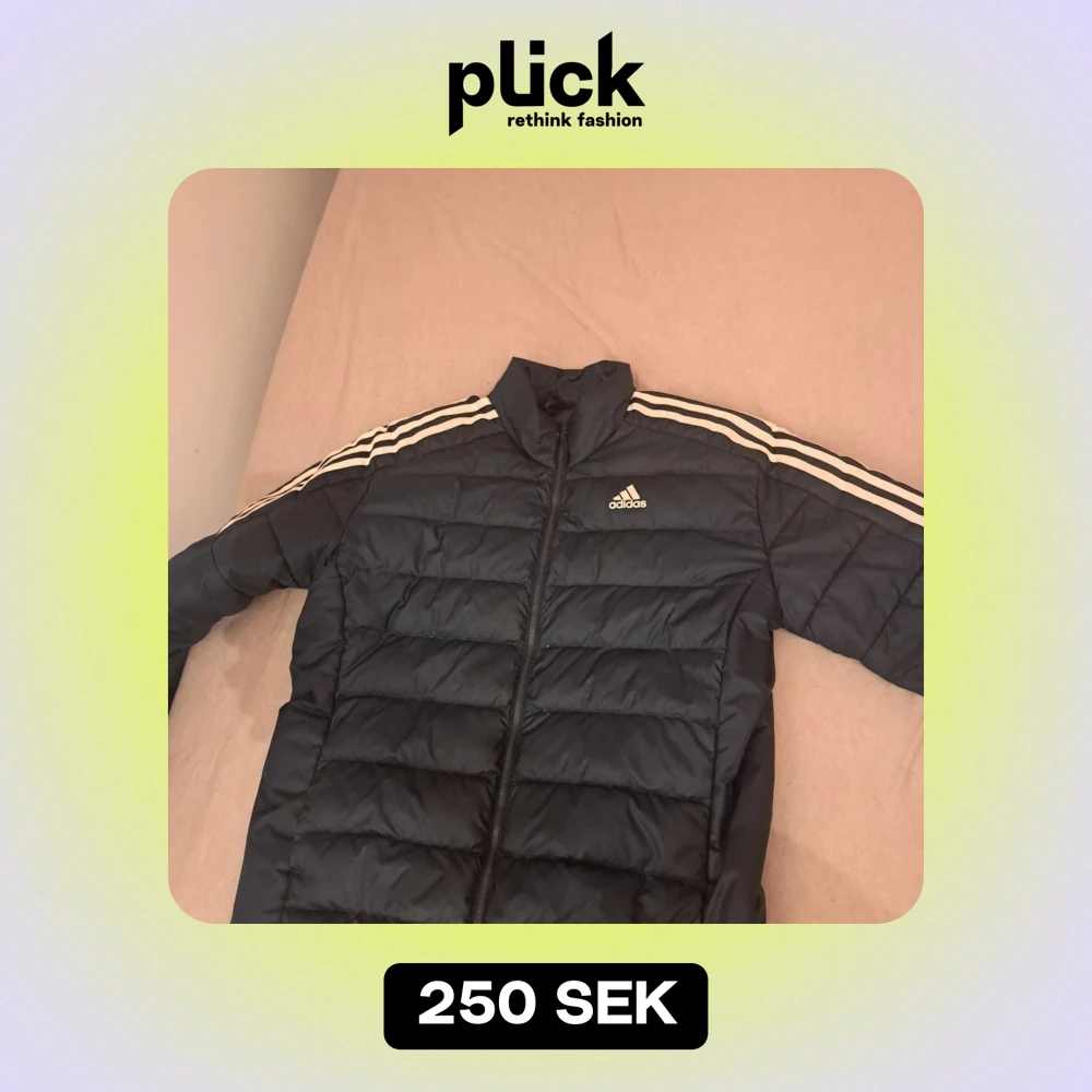 ‼️OBS PRIS GÅR ATT DISKUTERA Snygg mörkblå pufferjacka från Adidas med klassiska vita ränder längs ärmarna. Jackan har en dragkedja framtill och är perfekt för kyligare dagar. Den har en sportig look och är lätt att matcha med olika outfits.