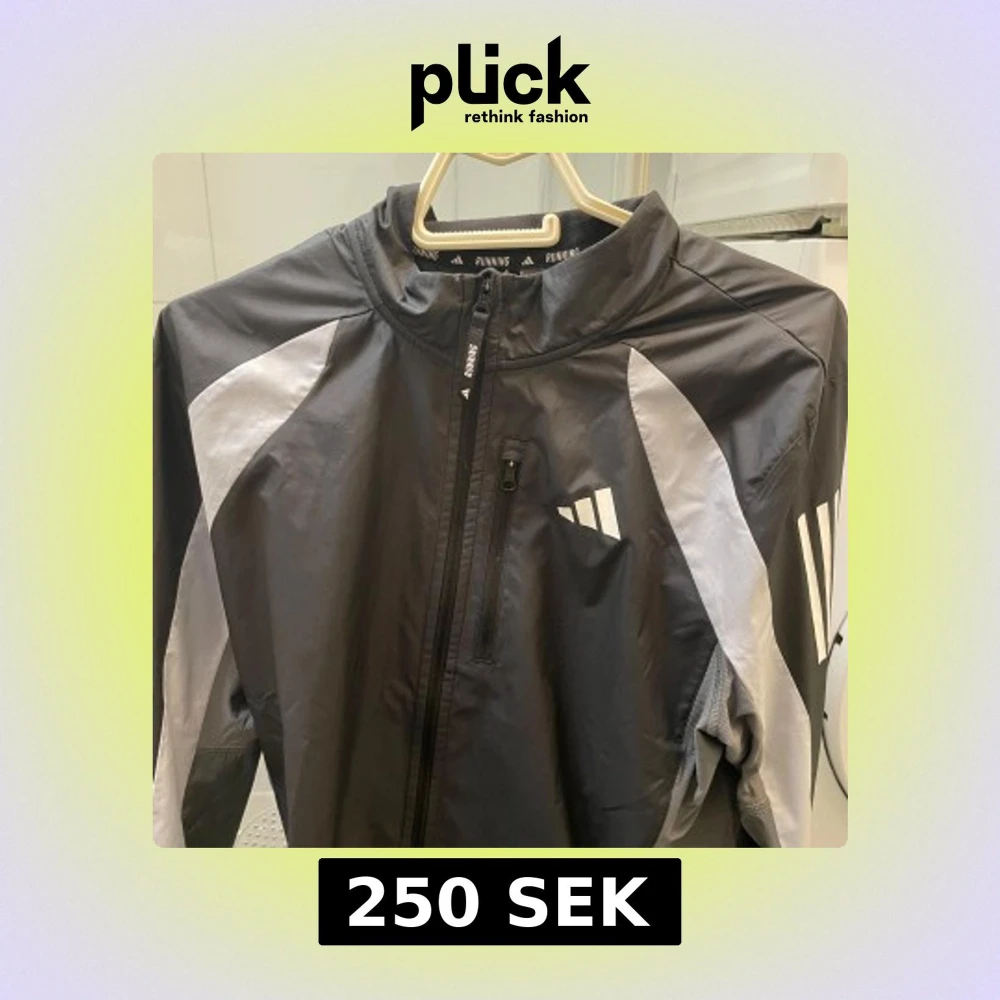 Säljer en svart och grå löparjacka från Adidas med dragkedja framtill. Jackan har en sportig design med vita detaljer och är perfekt för löpning. Den är tillverkad i ett lätt syntetmaterial och har långärmade ärmar.