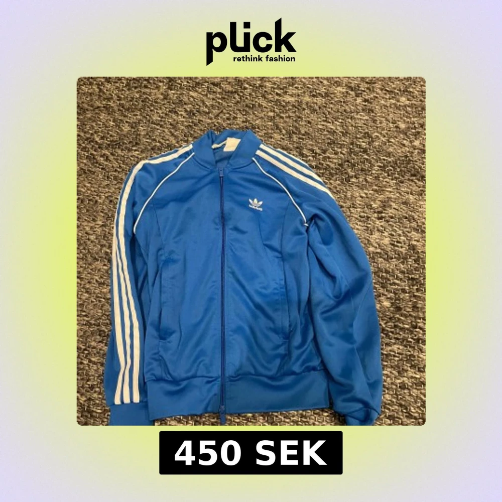 Snygg blå vindjacka från Adidas med klassiska vita ränder längs ärmarna och dragkedja framtill. Jackan har hög krage, två fickor och Adidas-logga på bröstet. Perfekt för en sportig och avslappnad stil.