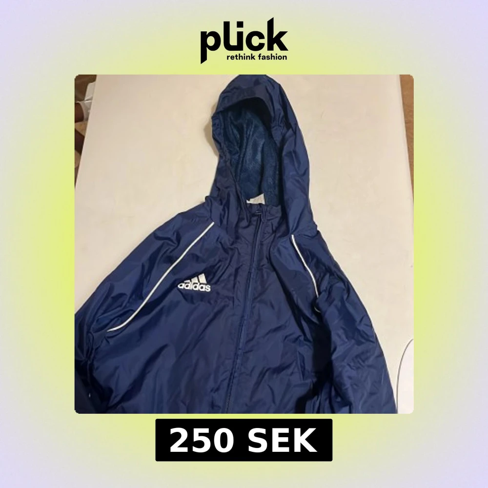 Snygg marinblå vindjacka från Adidas med vit logga på bröstet och vita detaljer längs axlarna. Jackan har huva, dragkedja framtill och elastiska muddar vid ärmsluten. Perfekt för blåsiga dagar och sportiga outfits.