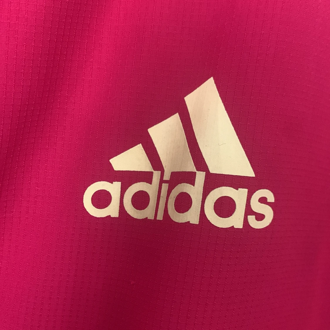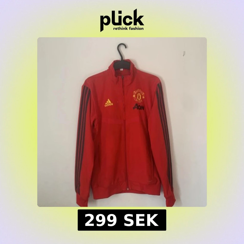 Snygg röd jacka från Adidas med Manchester United-logga och Aon-sponsortryck. Jackan har svarta ränder längs ärmarna och dragkedja framtill. Perfekt för fotbollsfans!