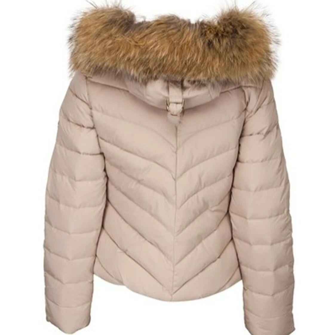 Hollies jacka i nyskick. Beige i färgen och har en stor luva med äkta päls. Gulddetaljer. Jackan passar storlek S och M.