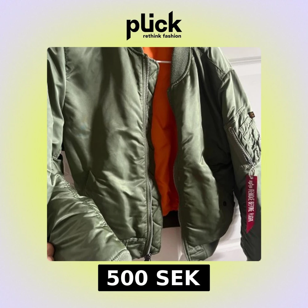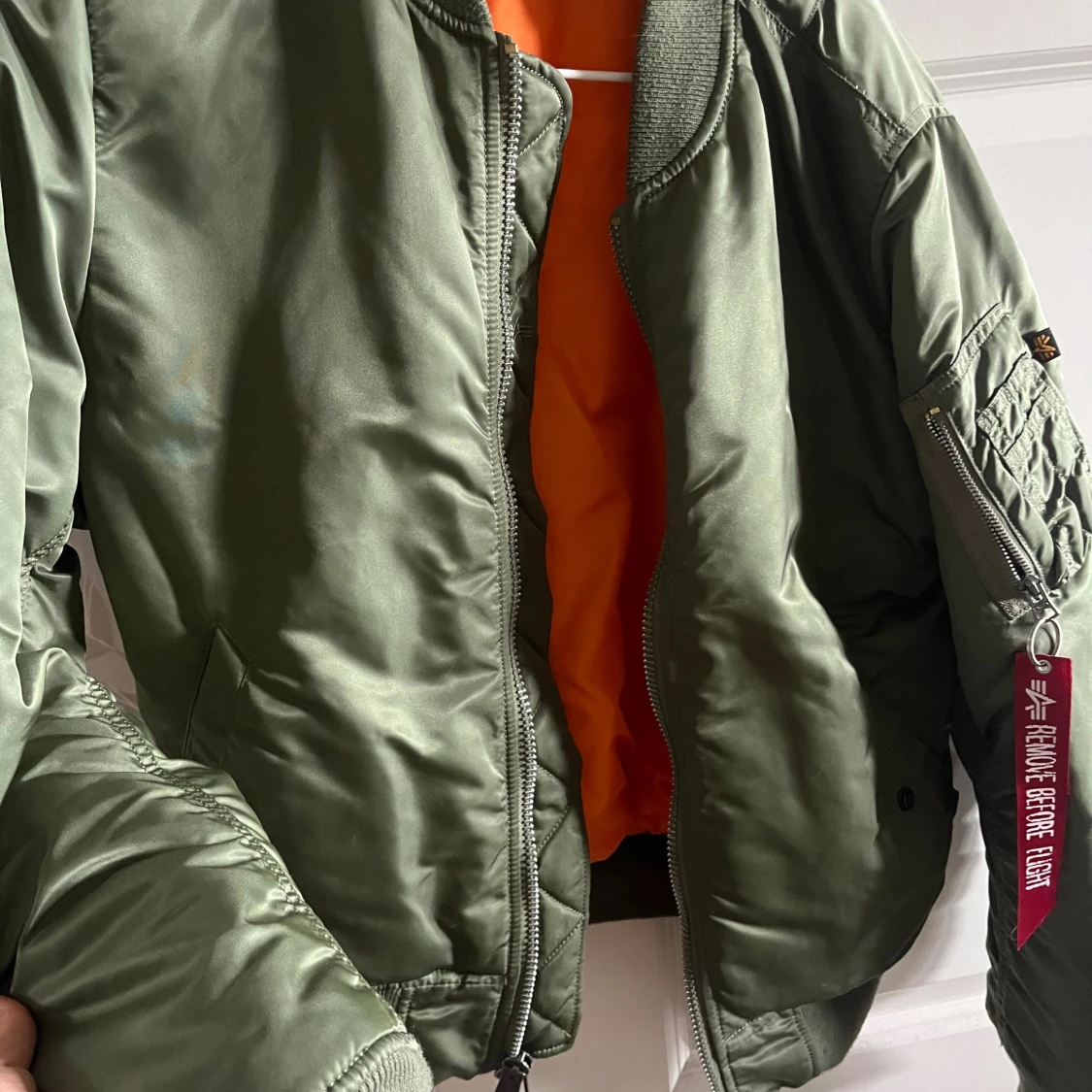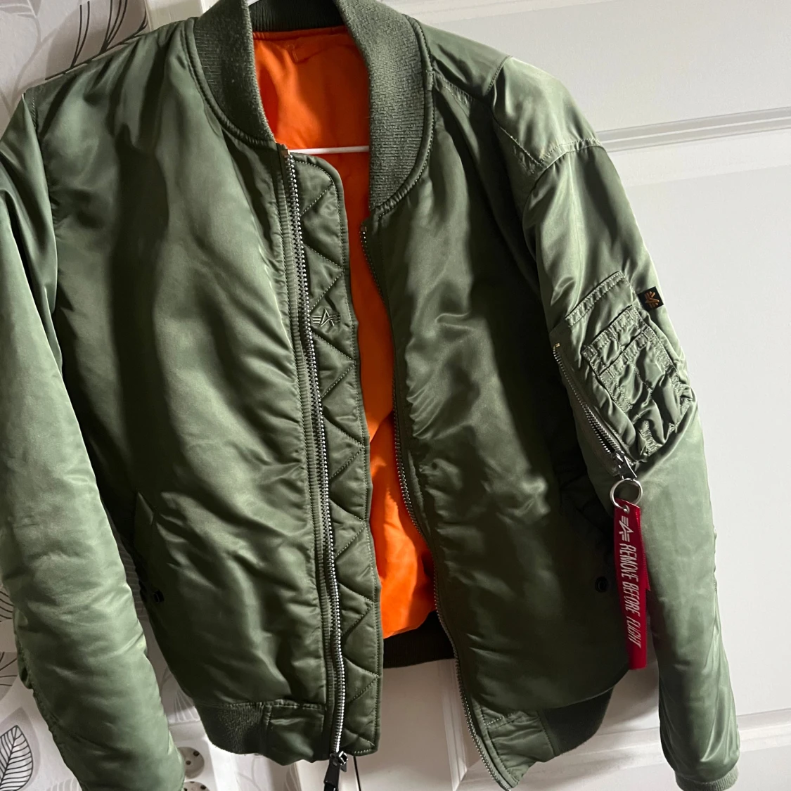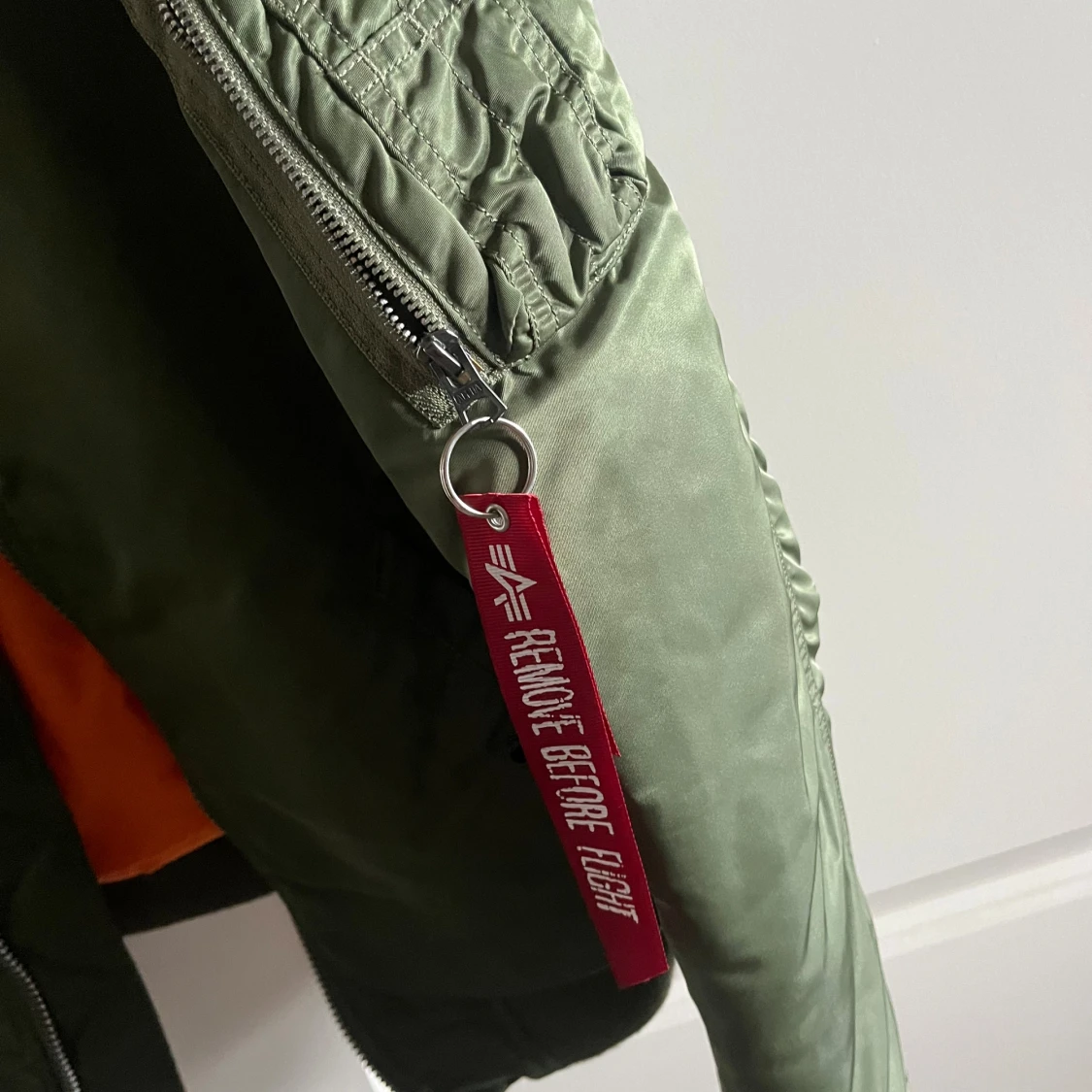 Säljer en klassisk grön bomberjacka från Alpha Industries med orange foder och ikonisk 'Remove Before Flight'-tag på ärmen. Jackan har dragkedja, ribbade muddar och flera fickor, perfekt för en cool streetstil.
