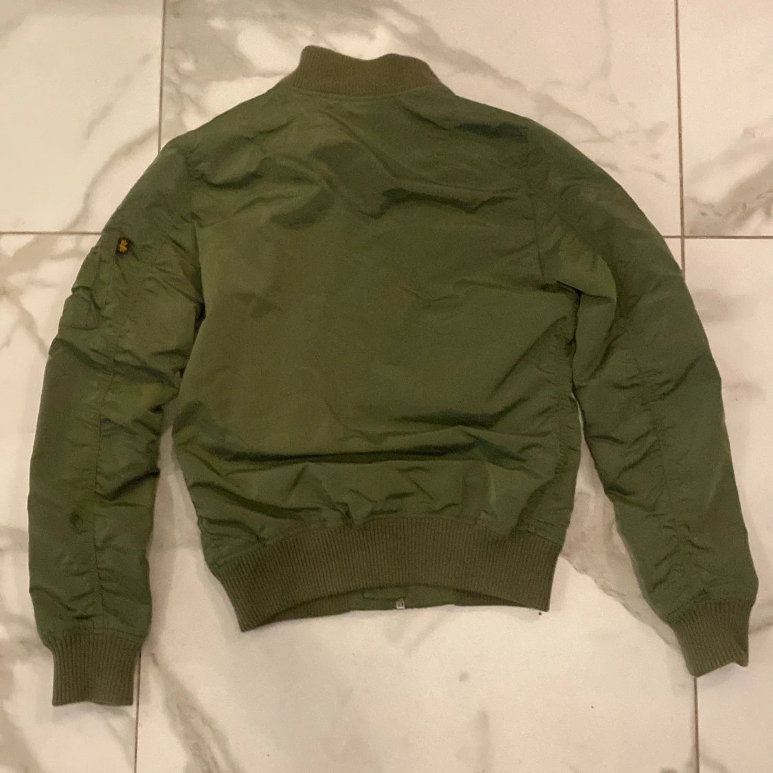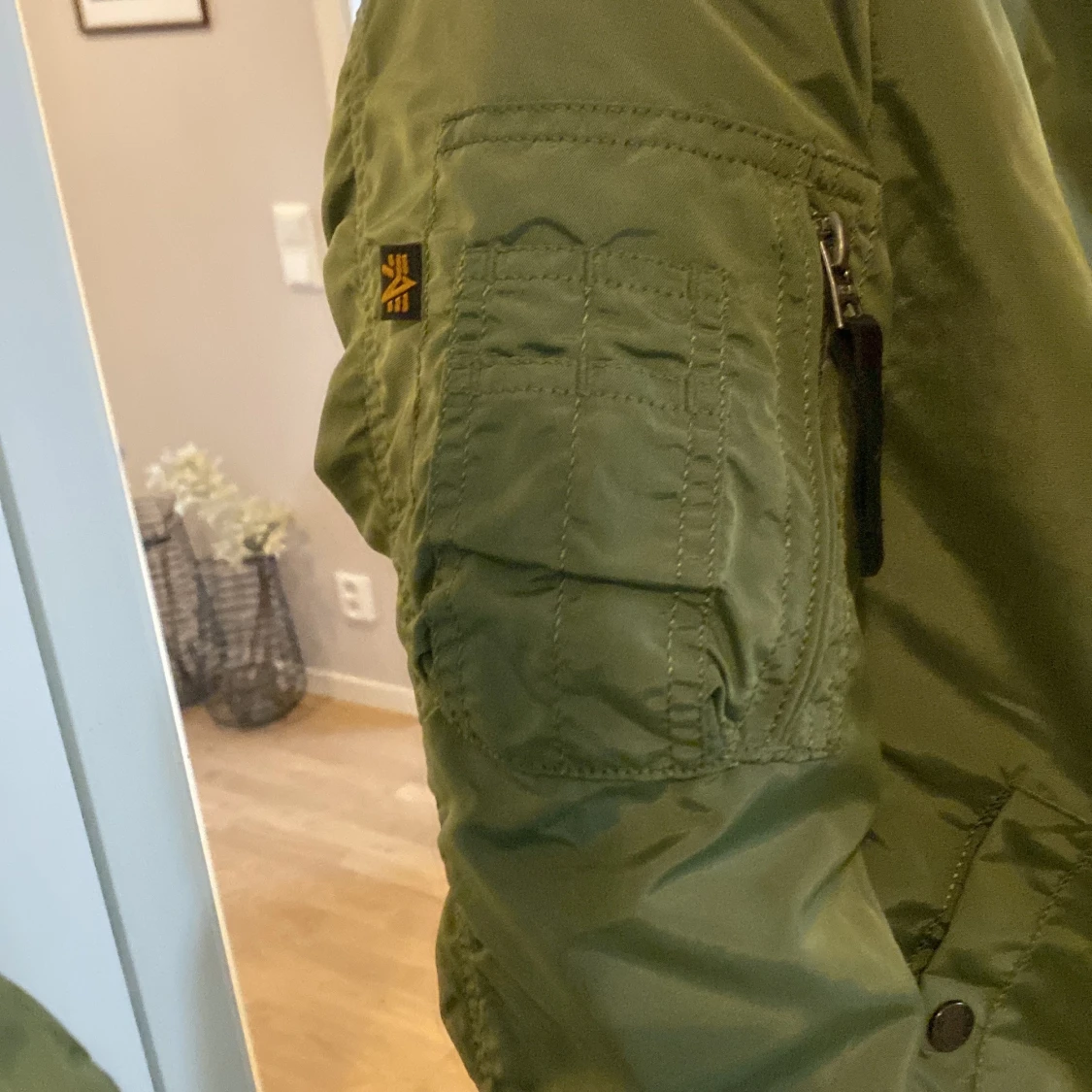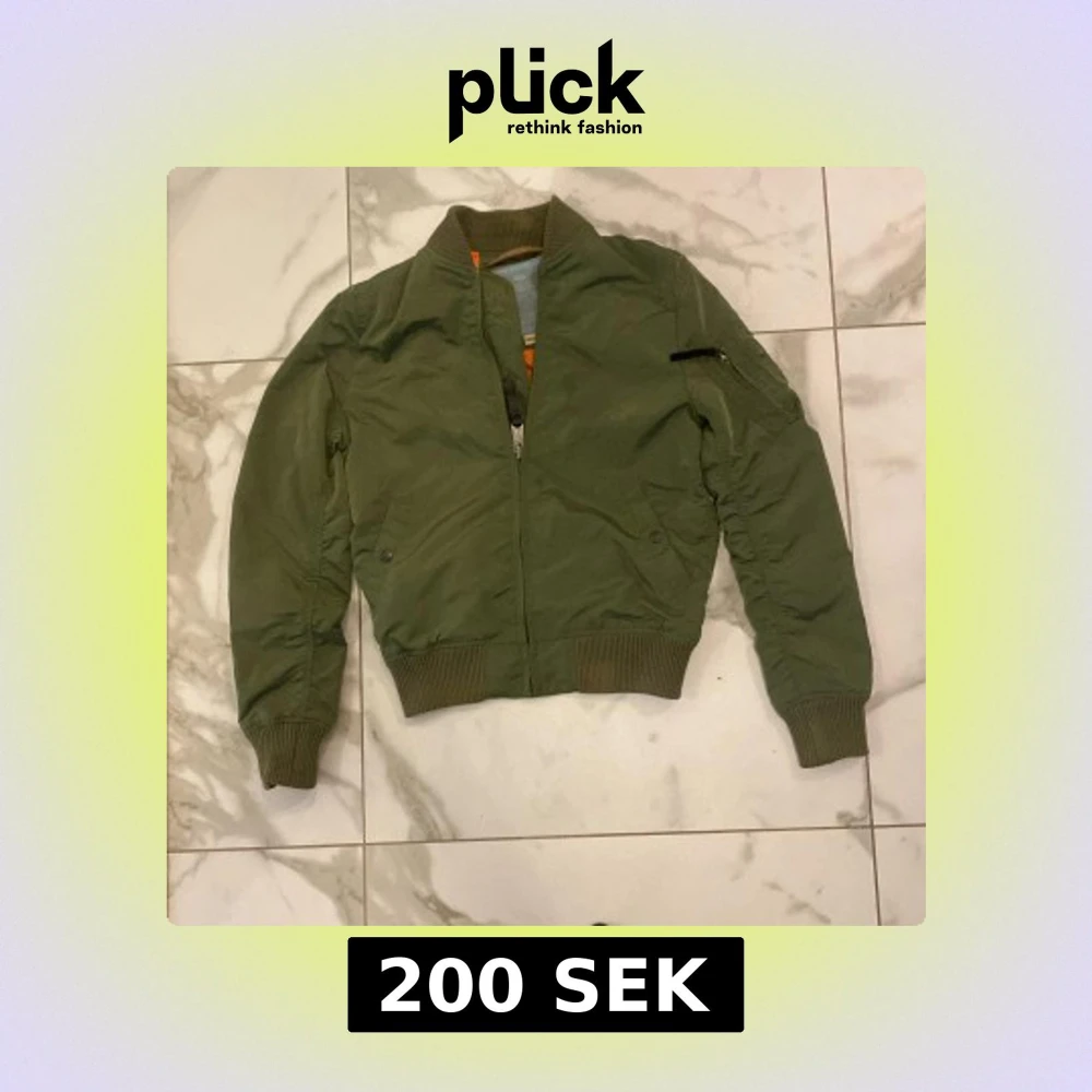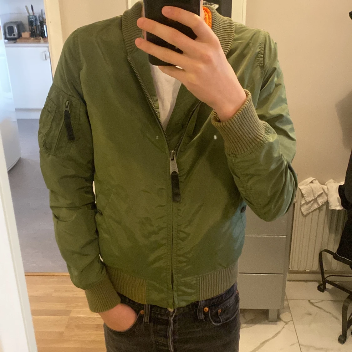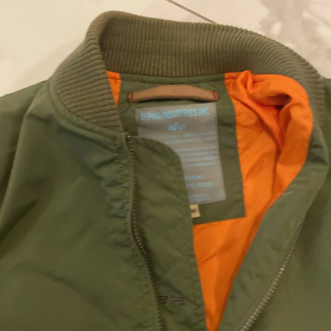 Säljer en klassisk grön bomberjacka från Alpha Industries med orange foder. Jackan har ribbade muddar, dragkedja framtill och fickor med tryckknapp samt en ärmficka med dragkedja. Perfekt för dig som vill ha en stilren och tidlös look.