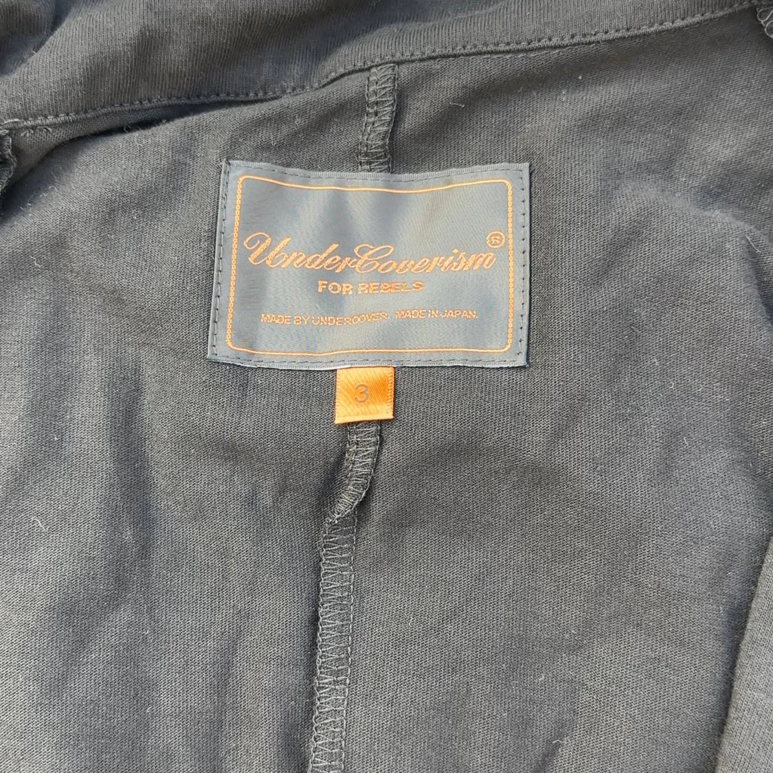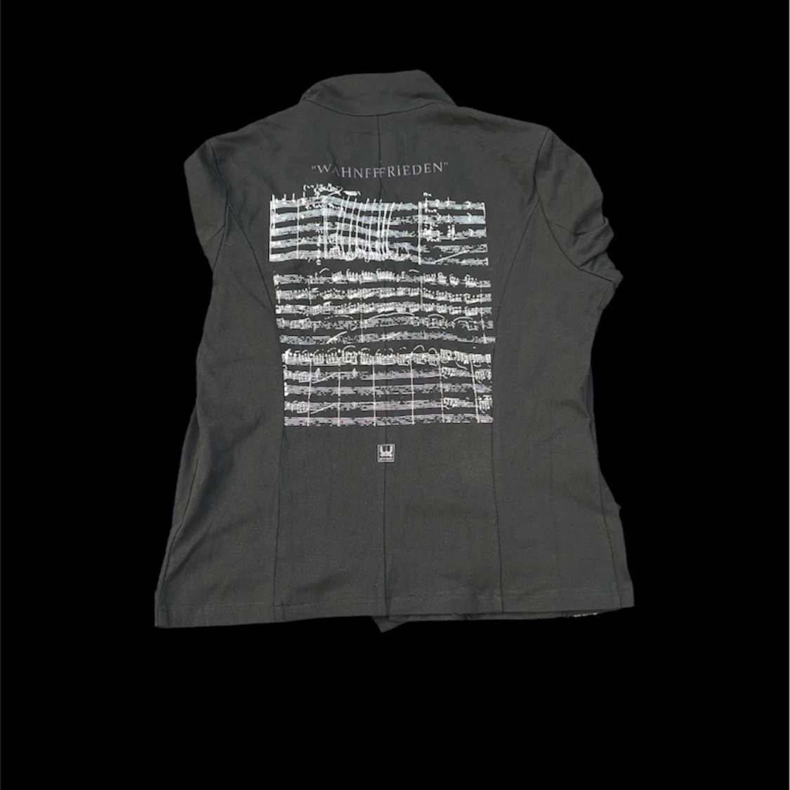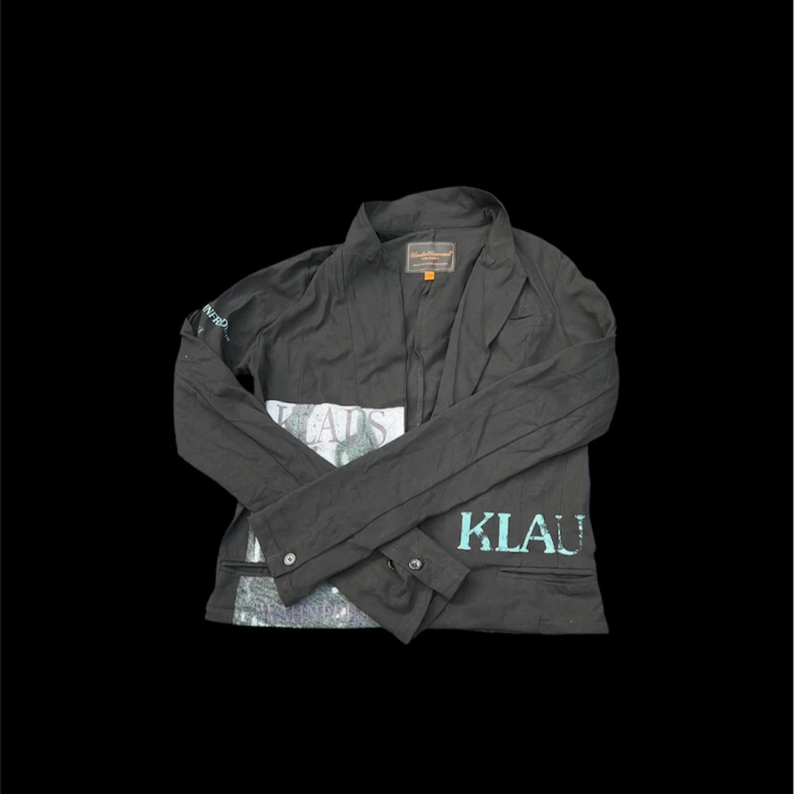 Svart kavaj från japanska undercover med tryck på både fram- och baksida. Framsidan har texten 'KLAUS' och baksidan har ett stort vitt nottryck och texten 'WAHNFRIEDEN'. Kavajen har klassisk krage, knappar vid ärmslut och två fickor framtill. Perfekt för dig som gillar unik streetwear.