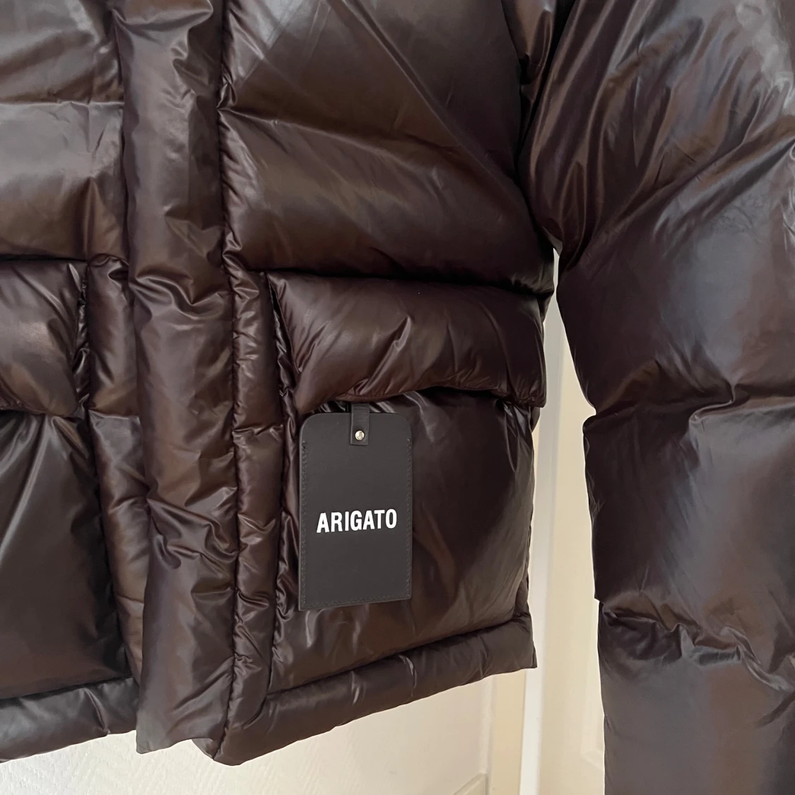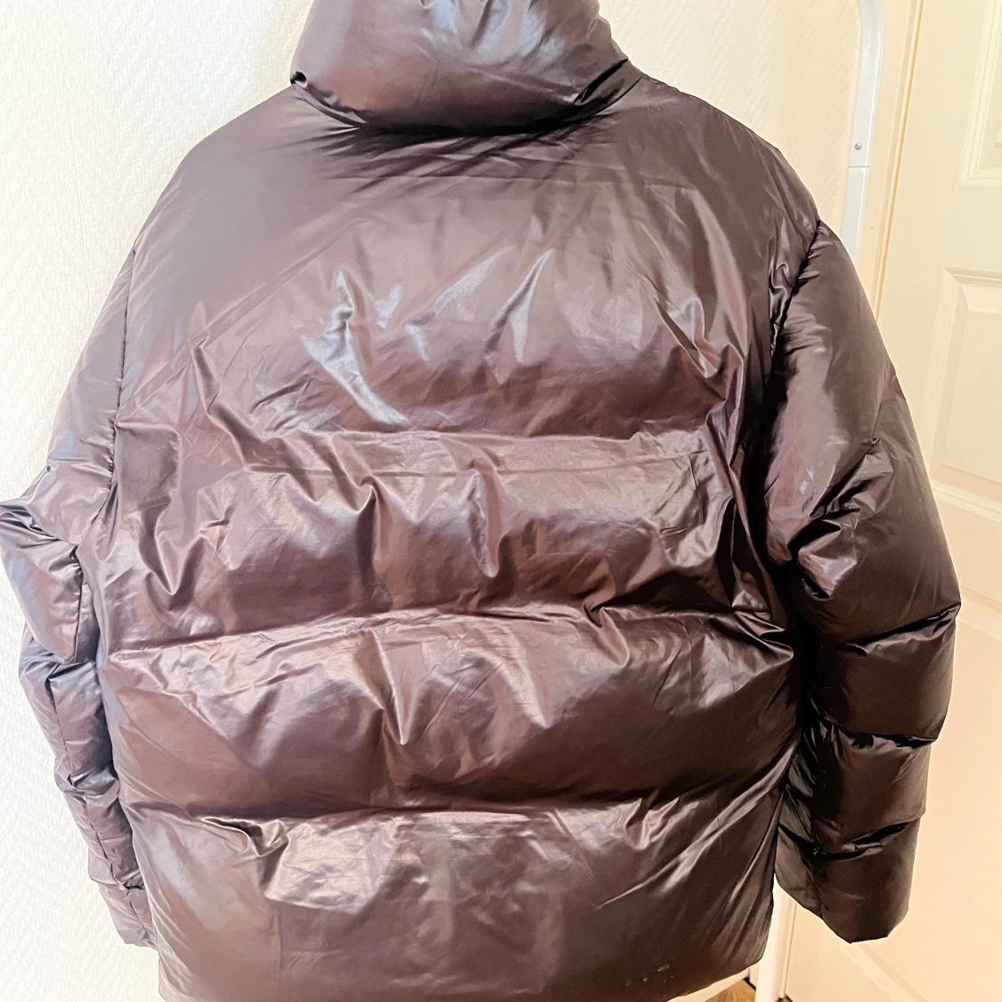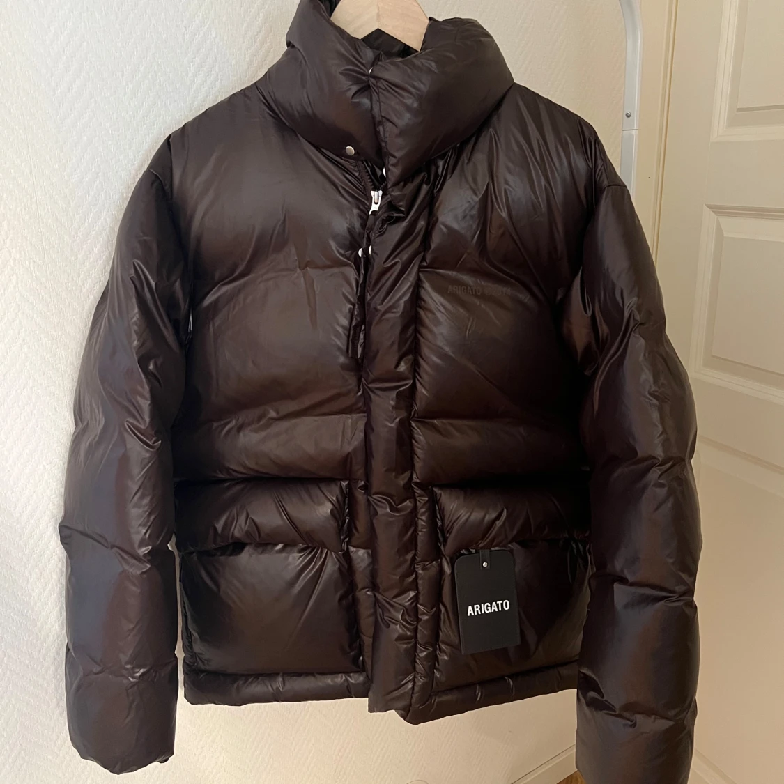 Säljer en mörkbrun pufferjacka från Axel Arigato med hög krage och breda, quiltade sektioner. Jackan är tillverkad av återvunnen polyester och reprocessed dun, har långa ärmar och en stilren look. Perfekt för kalla dagar och har en snygg, oversized passform.