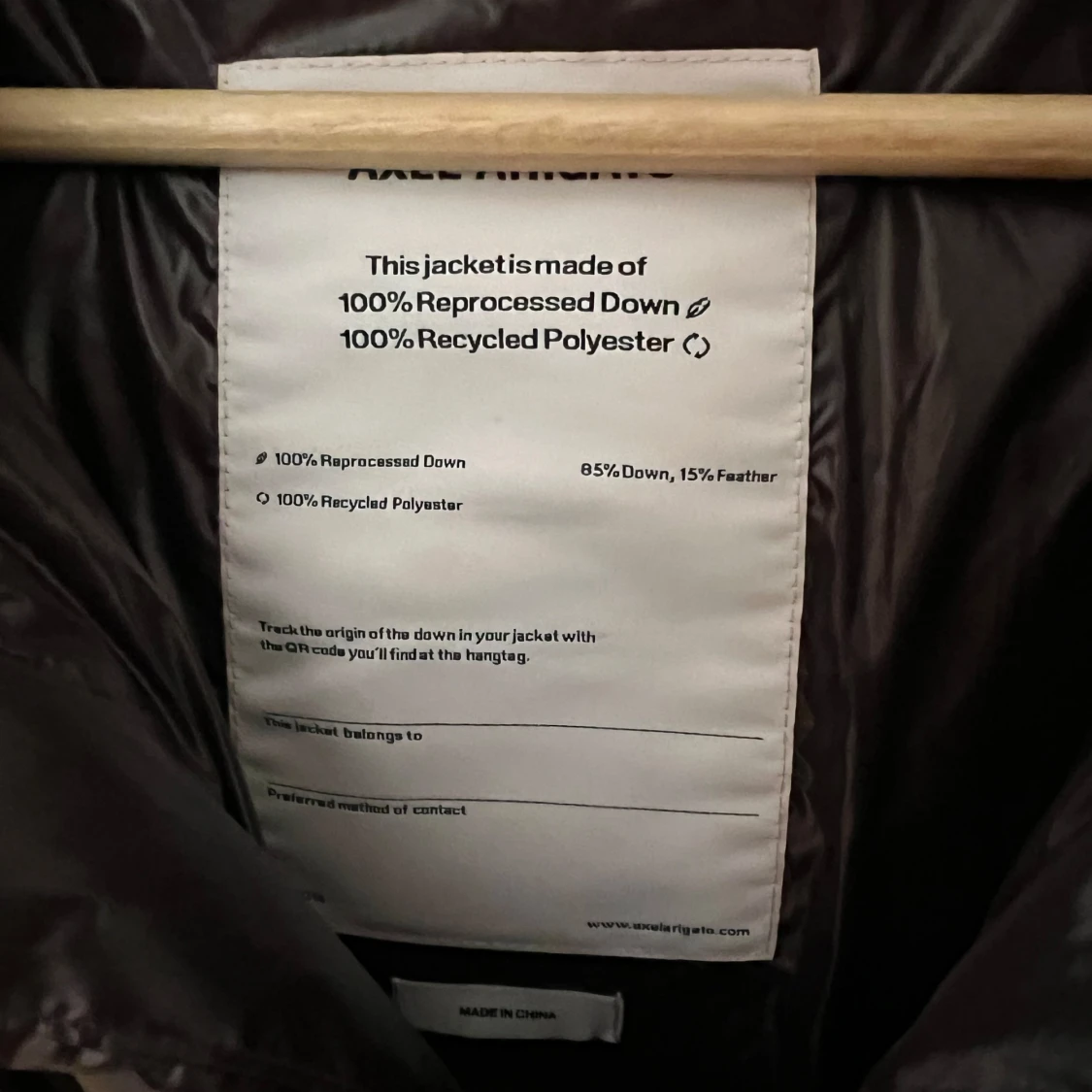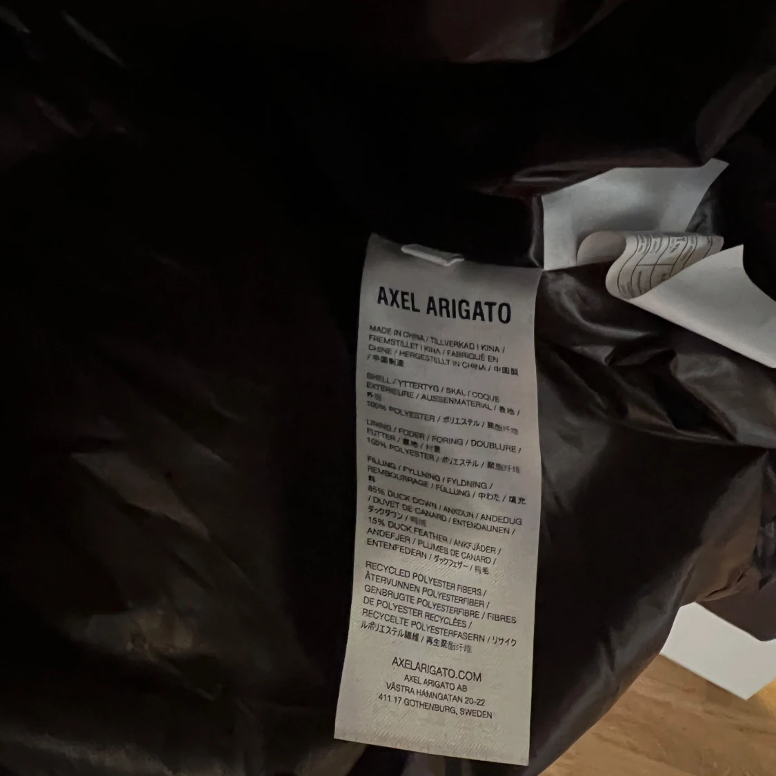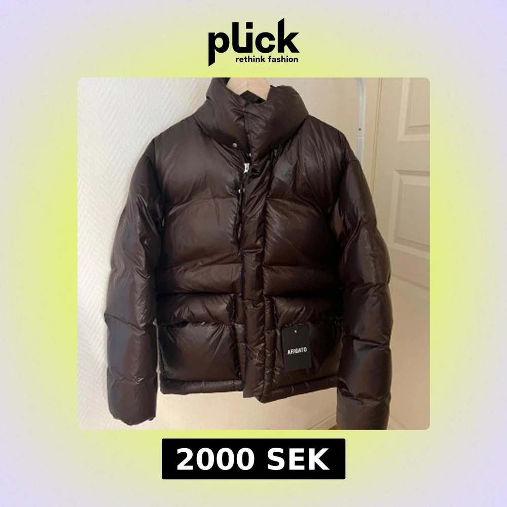 Säljer en mörkbrun pufferjacka från Axel Arigato med hög krage och breda, quiltade sektioner. Jackan är tillverkad av återvunnen polyester och reprocessed dun, har långa ärmar och en stilren look. Perfekt för kalla dagar och har en snygg, oversized passform.
