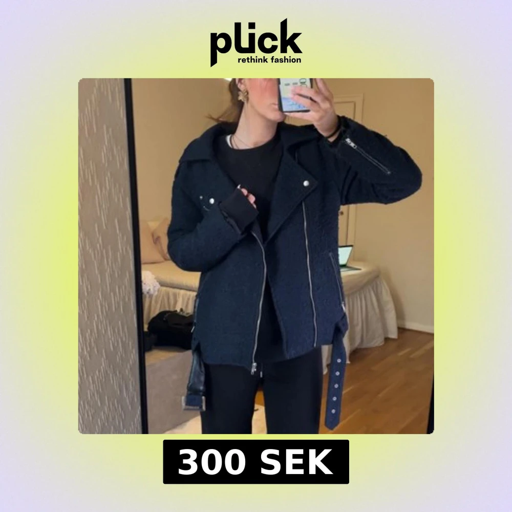 Snygg mörkblå jacka med dragkedja och bälte. Jackan har en texturerad yta och långa ärmar. Perfekt för våren eller kallare kvällar dagar. Samma stil som en skinnjacka fast i mjukt material. Från Bikbok