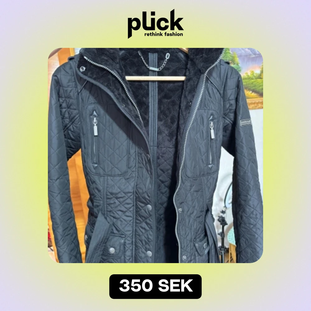 Säljer en snygg svart quiltad jacka från Barbour International. Jackan har en stilren design med dragkedja och knappar framtill. Den är långärmad och har flera praktiska fickor med dragkedjor. Perfekt för höst och vår!
