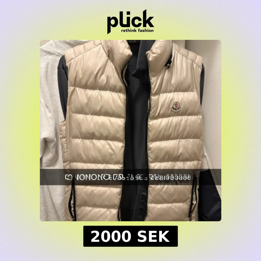 Snygg beige dunväst från Moncler med quiltad design och hög krage. Västen har dragkedja framtill och två fickor med dragkedja. Klassisk Moncler-logga på bröstet. Perfekt att slänga över en hoodie för en clean look.