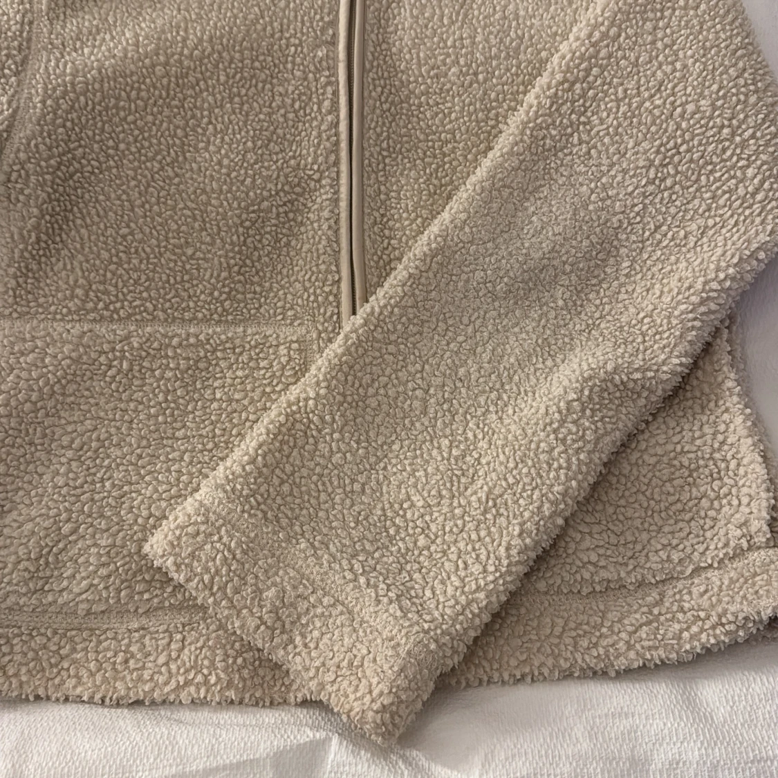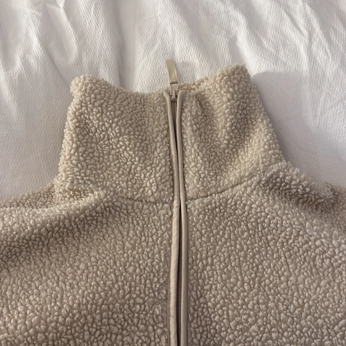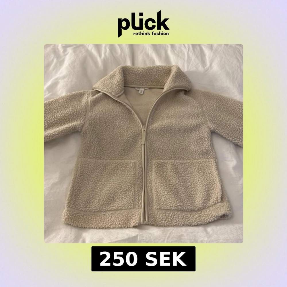 Mysig beige teddyjacka från H&M med dragkedja framtill och två stora fickor. Jackan har hög krage och är tillverkad i mjuk fleece som håller dig varm under kyliga dagar. Perfekt för dig som gillar en chill och avslappnad stil.