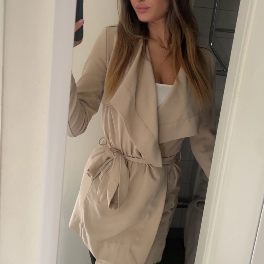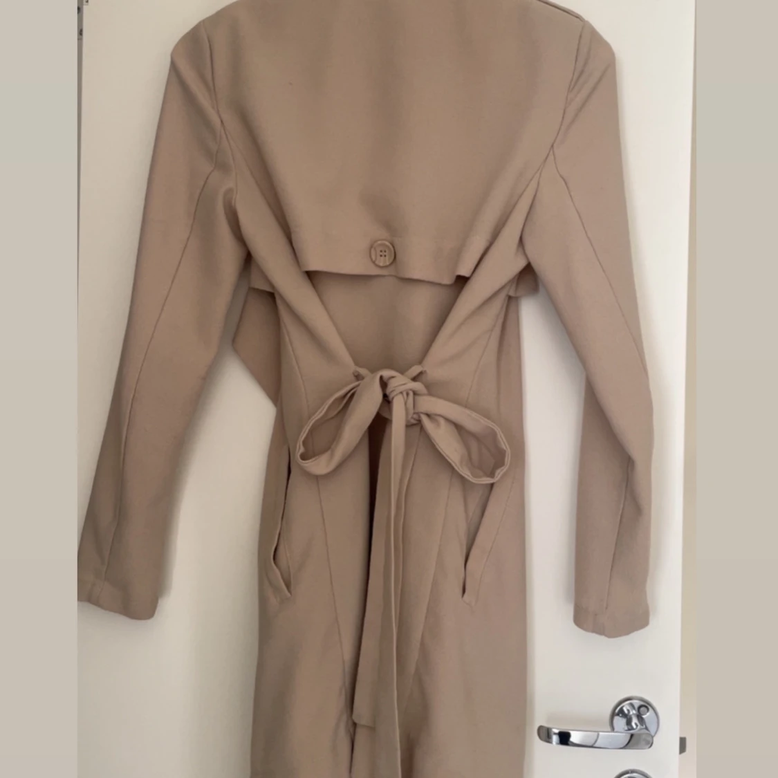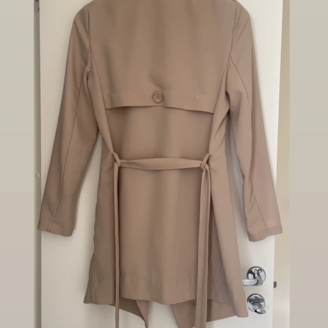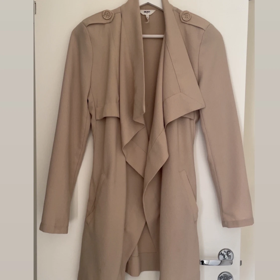 Snygg beige kappa från Object med skärp i midjan. Jackan har långa ärmar, knappar på axlarna och en avslappnad passform och slutar över knäna. Är i mycket väl skick. Perfekt för vår och höst när du vill ha en stilren look.