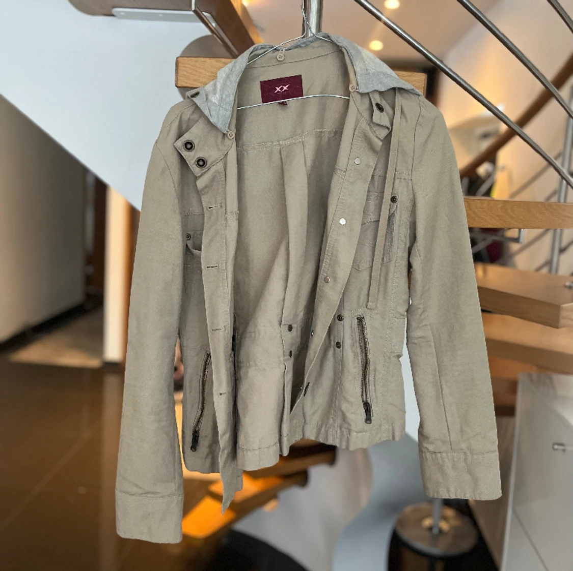 En beige jacka/kavaj som passar bra till både vår och höst. Finns inne i färgen beige och jackan är i bra skick. Jackan innehåller en luva som går att ta bort och sätta tillbaka vid behov.