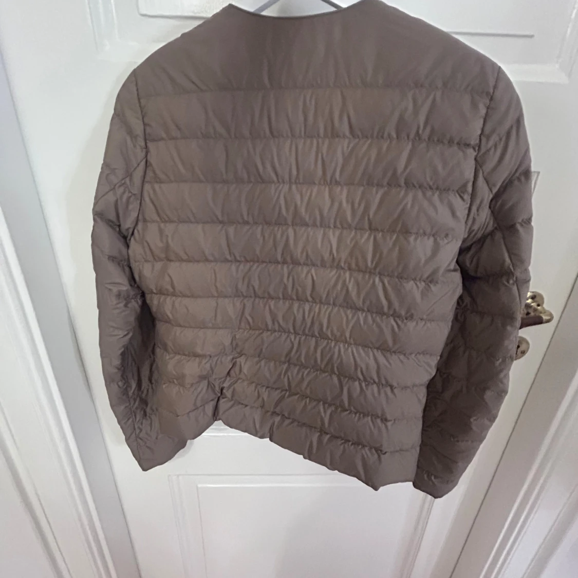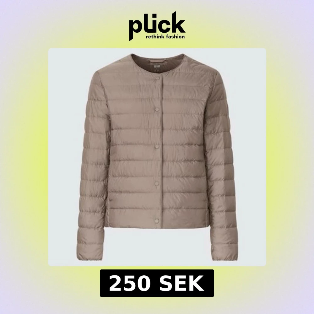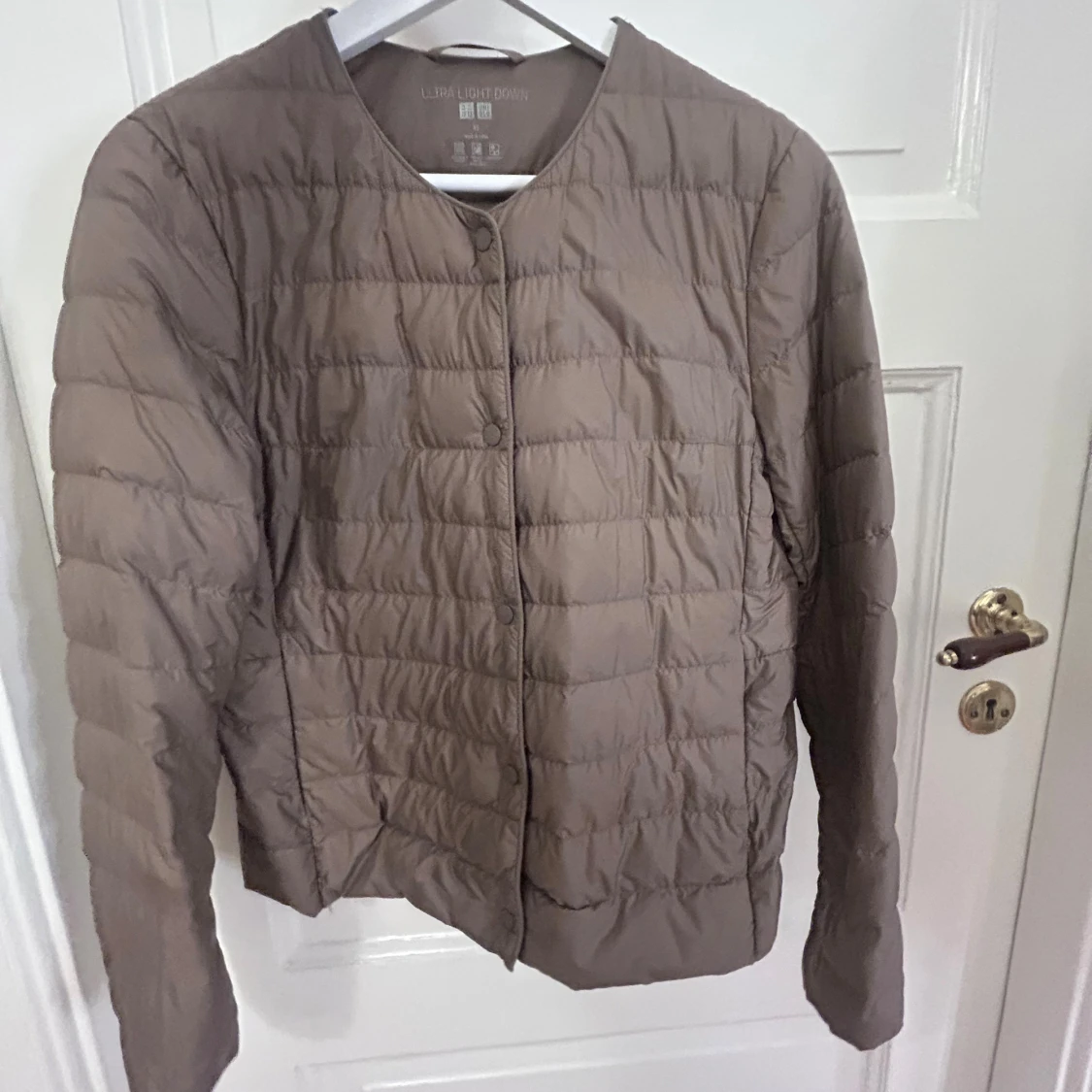 Snygg beige lättviktsdunjacka från Uniqlo med rund halsringning och knäppning framtill. Jackan ser mörkar ut på bilden pga ljuset. Denna färg säljs ej längre.
