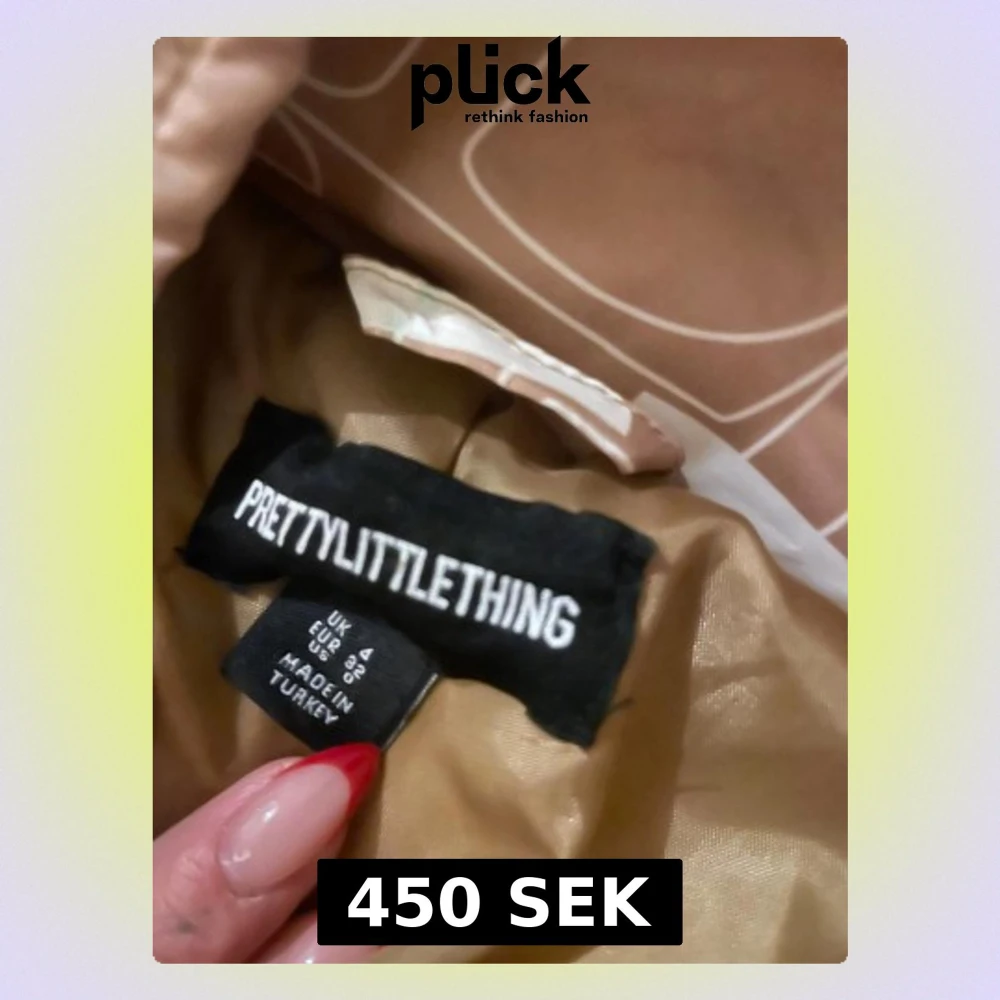 Säljer en beige cropped pufferjacka från PrettyLittleThing med stort vitt logomönster över hela jackan. Jackan har dragkedja framtill och är quiltad för extra volym. Perfekt för dig som vill sticka ut med en trendig look.