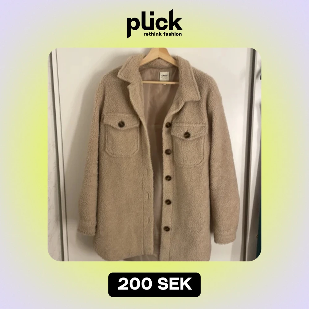 Säljer en supermysig beige teddyjacka från ONLY. Den har en oversized passform och är perfekt för höst och vinter. Jackan har långa ärmar och stängs med knappar framtill. Två stora bröstfickor med knappar ger en cool look. Dock har den lite missfärgning på insida kant, men det är inget märkvärdigt eller något som annars syns.