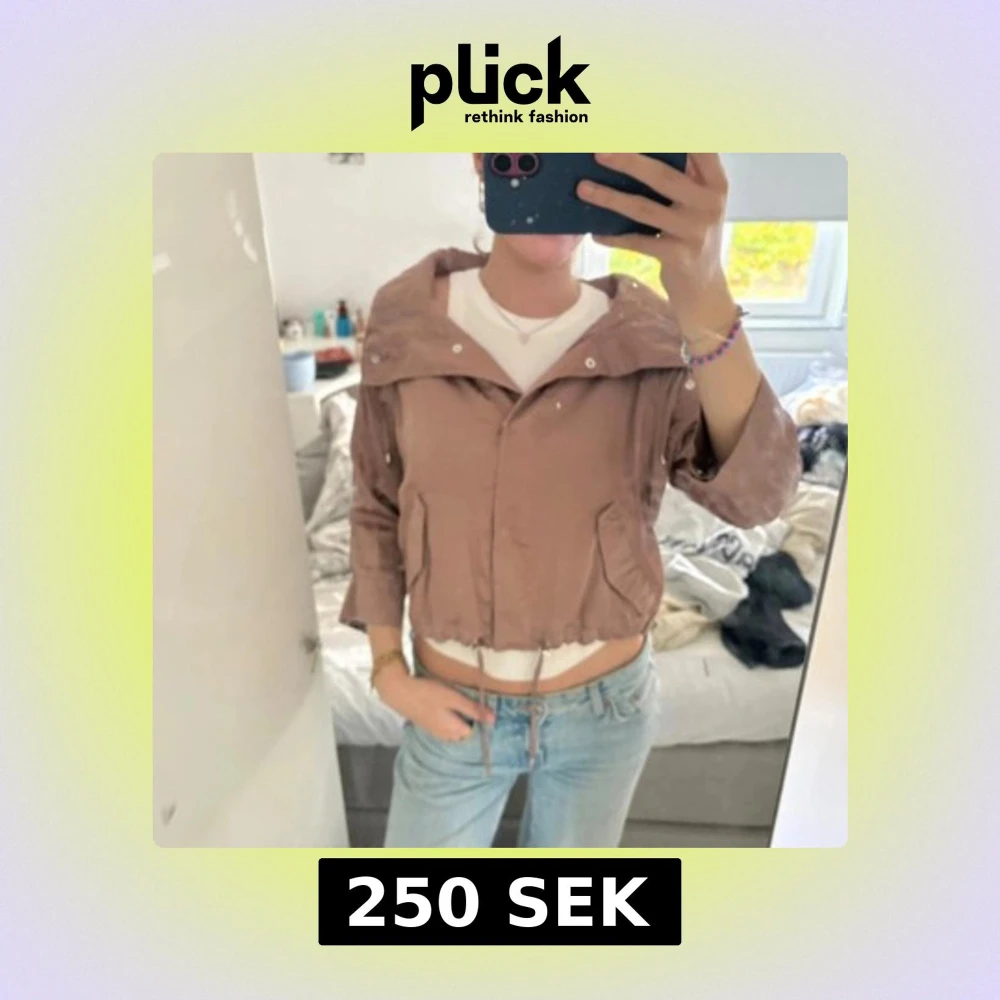 Säljer en beige cropped vindjacka med bred krage och snörning i midjan. Jackan har trekvartsärmar och två fickor framtill. Perfekt för dig som gillar en avslappnad och trendig stil.