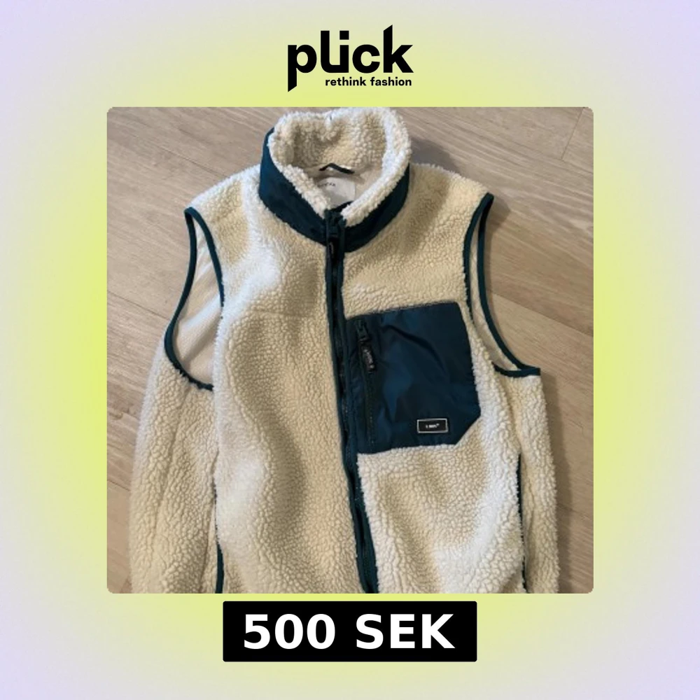 Mysig vit fleeceväst från Bershka med hög krage och gröna detaljer. Västen har en stor grön bröstficka med dragkedja och matchande gröna kantband. Perfekt för lager-på-lager och chill dagar.