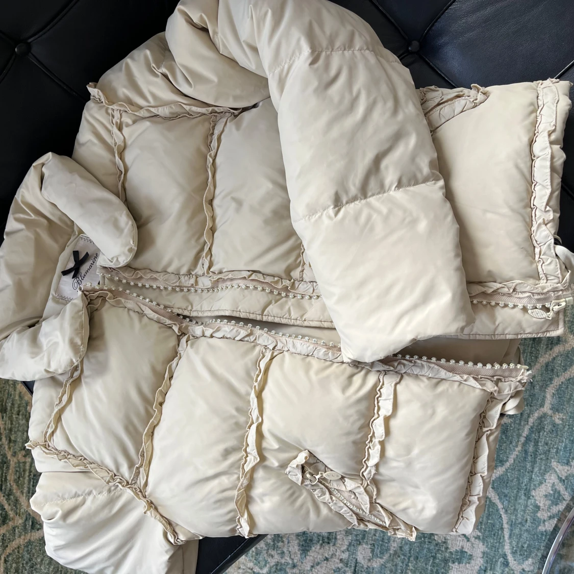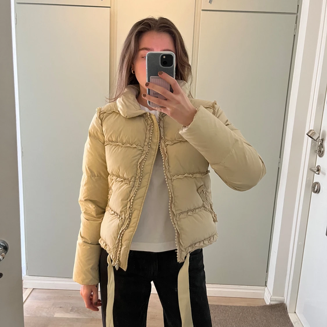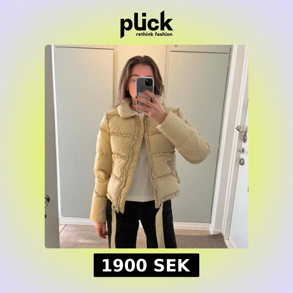 Ljus beige dunjacka från Blumarine. Jackan är vintage så finns små märken på den. Så fin!! Italiensk storlek 42 vilket är small. Den är väldigt lång i ärmarna vilket är skönt när det är kallt