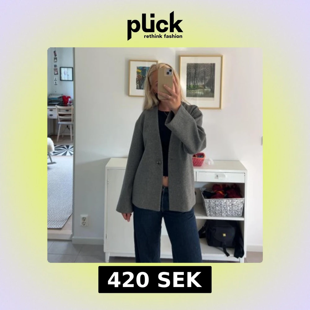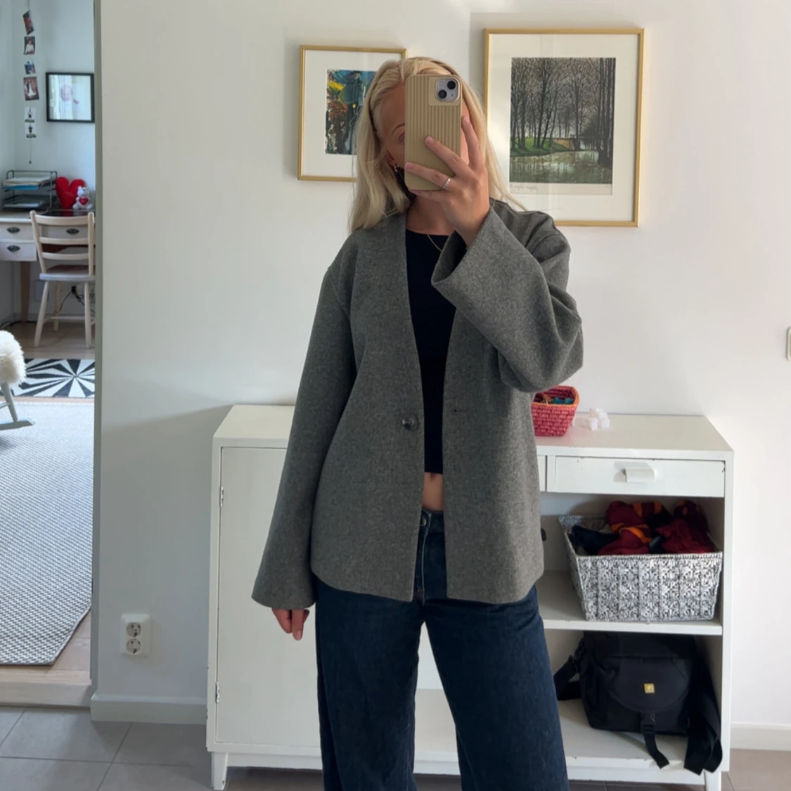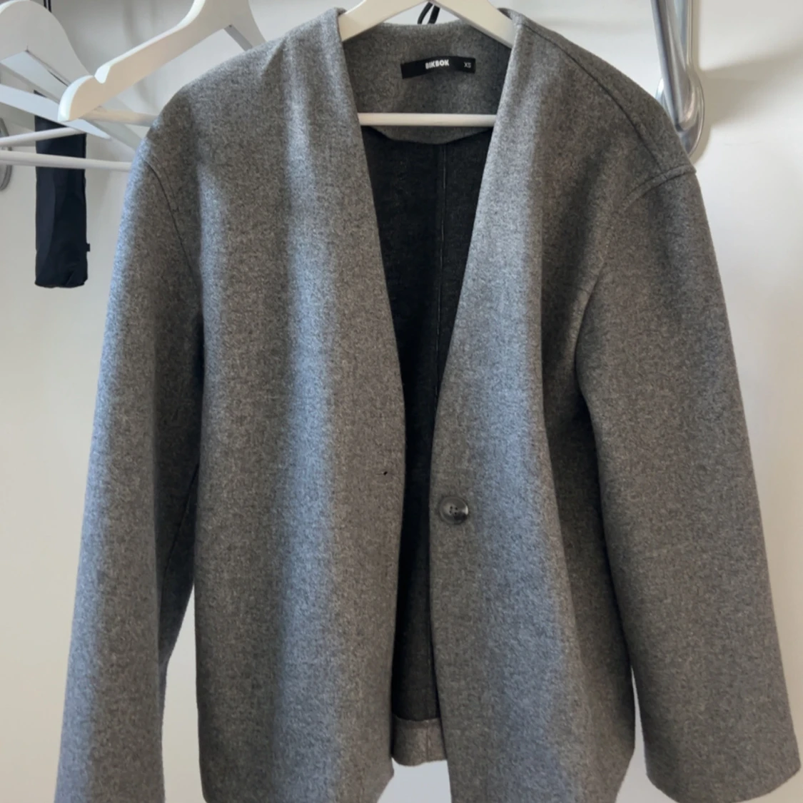 Snygg grå kavajjacka från Bik Bok i rak modell med en knapp framtill. Jackan har lång ärm, enkel design och är gjord i ett mjukt material som känns lite ulligt. Perfekt att slänga över en hoodie eller t-shirt för en clean look. Denna är stor i storleken, passar min som brukar ha S/M i jackor/kappor vanligtvis.