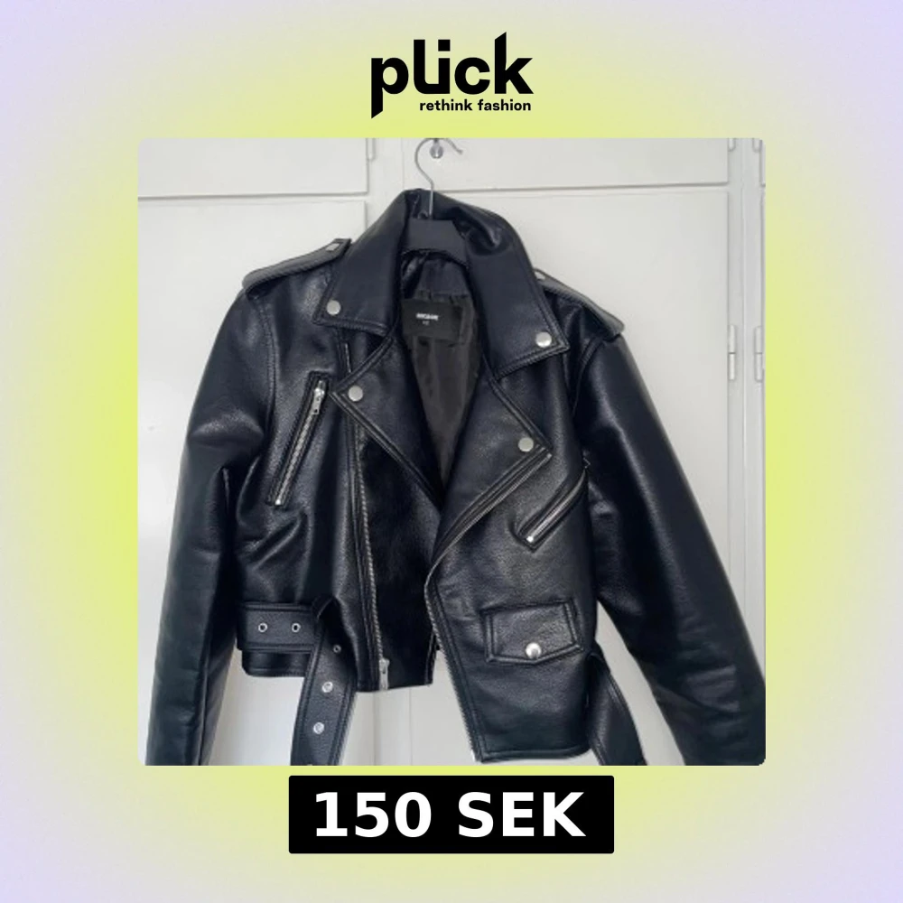Snygg svart skinnjacka från Bik Bok i klassisk bikerstil med silvriga dragkedjor, knappar och bälte i midjan. Jackan har flera fickor och coola detaljer som axelklaffar och croppad passform. Perfekt för att lyfta vilken outfit som helst.