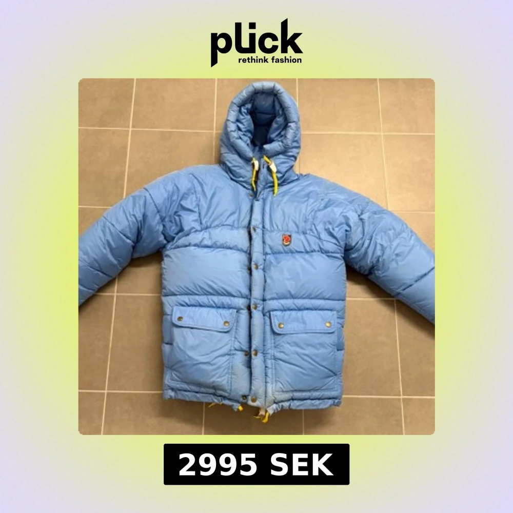 Säljer en blå dunjacka från Fjällräven i storlek XS/S. Jackan har huva med gula snören, två stora fickor med knappar framtill och klassisk Fjällräven-logga på bröstet. Perfekt för kalla dagar med sin fluffiga och quiltade design. Sitter mer som S.