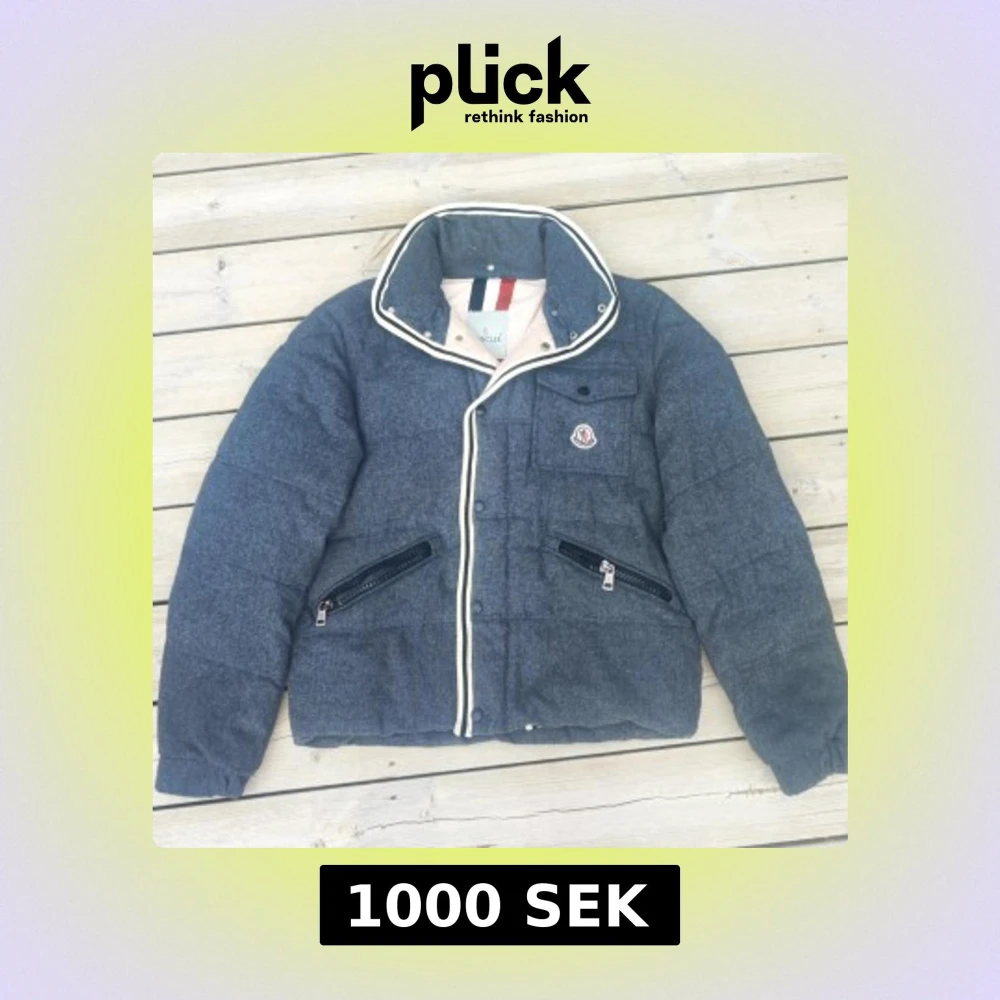 Säljer en snygg grå dunjacka från Moncler med vita detaljer. Jackan har en quiltad design och dragkedjor på fickorna. Insidan är ljus med ett färgglatt mönster. Perfekt för kyliga dagar! Vid pris och frågor kontakta gärna!