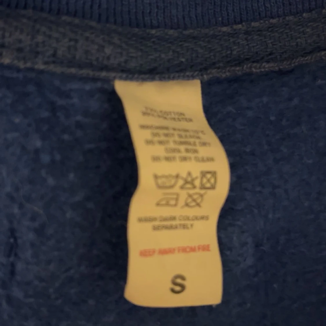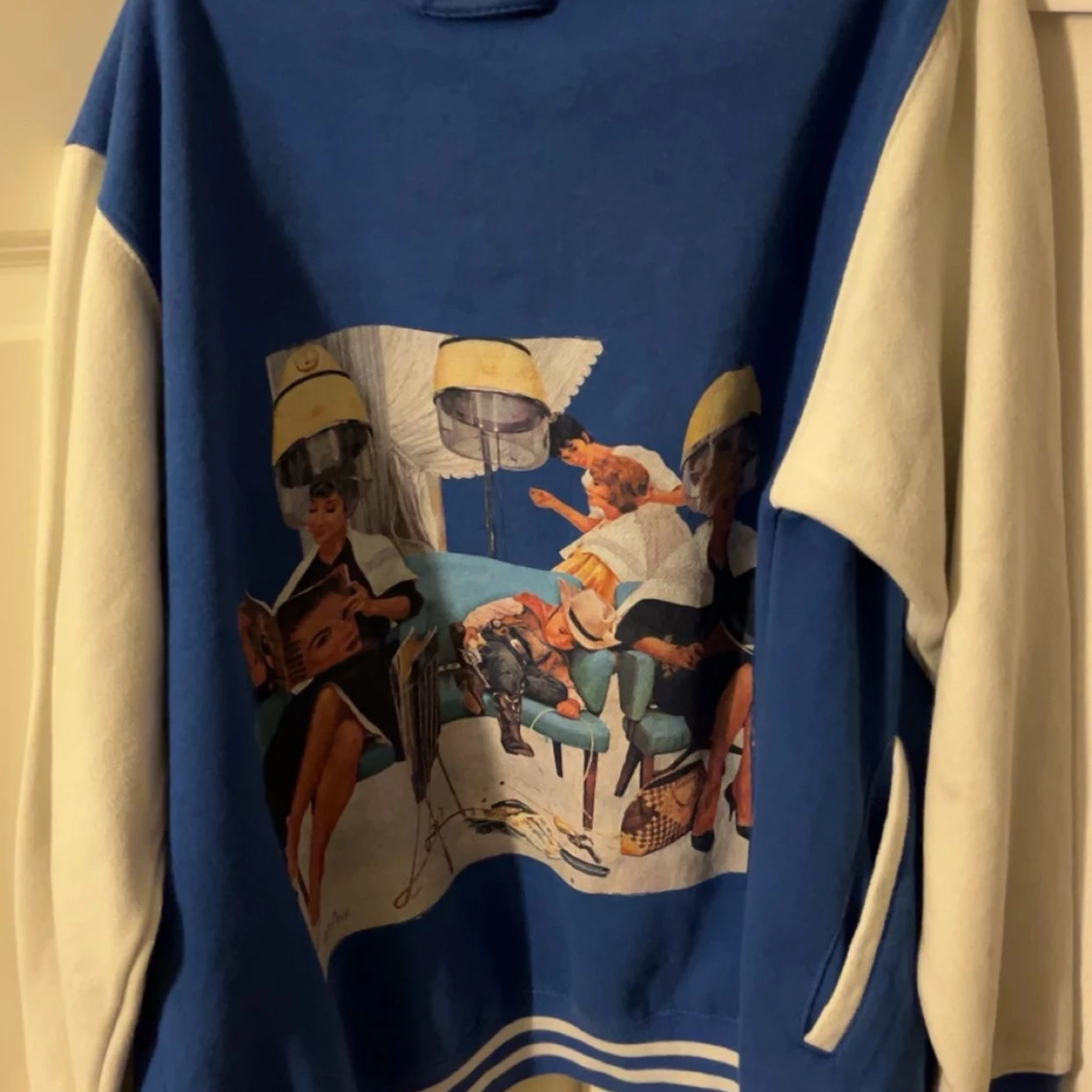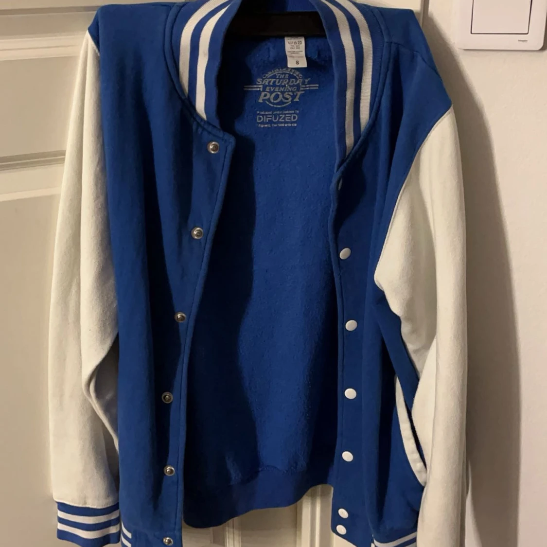 Säljer en blå och vit jacka från Diffuzed med ett coolt tryck på baksidan. Jackan har långa ärmar och knappar framtill. Den är gjord av bomull och polyester. Används aldrig💗