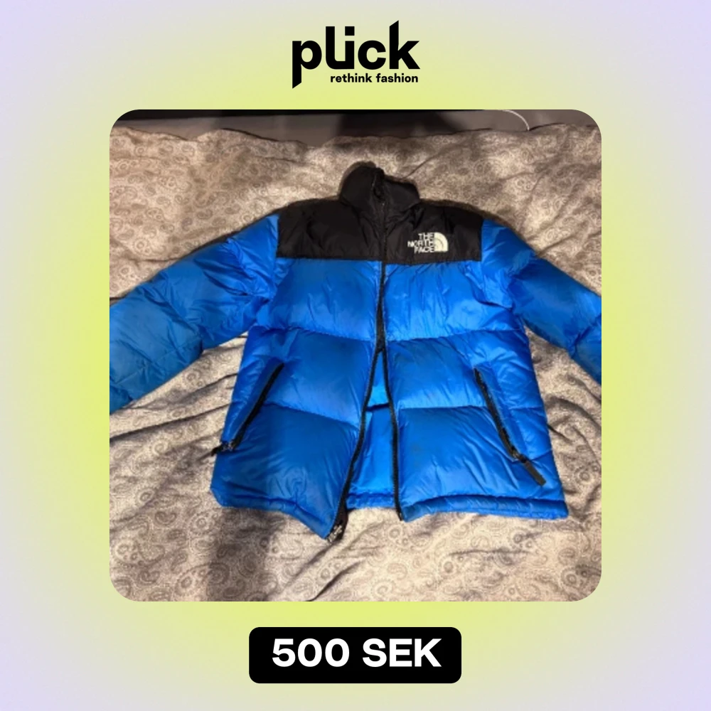 En blå north face jacka som är i storleken XL i barnstorlek.