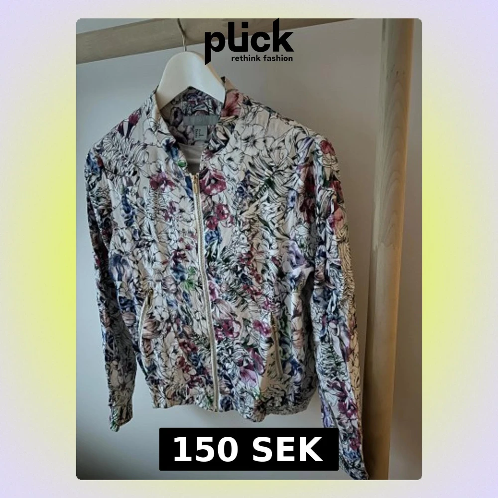 Snygg bomberjacka från H&M i storlek 36 med blommigt mönster i lila, blått, grönt och rosa på ljus botten. Jackan har dragkedja framtill, två fickor med dragkedja och resår i midja och ärmslut.