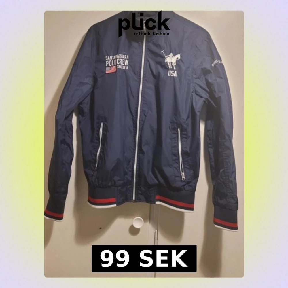 Säljer en marinblå vindjacka från Vinson Polo Club med vita och röda detaljer. Jackan har dragkedja framtill, två fickor med dragkedja och broderade loggor på bröstet och ärmen. Ribbstickade muddar med röd och vit rand ger en sportig look.