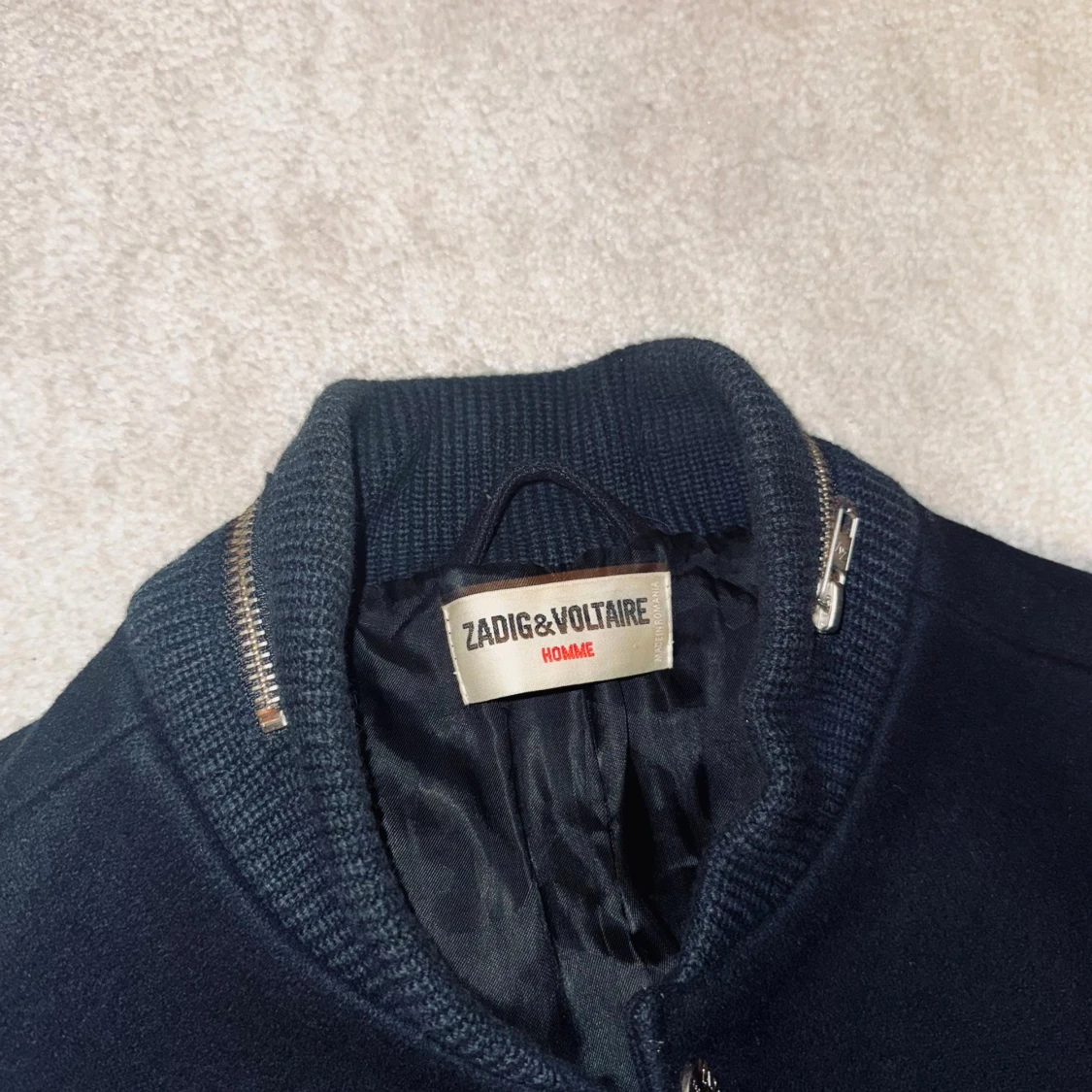 Snygg blå bomberjacka från Zadig & Voltaire med vita ärmar och vita detaljer vid fickorna. Jackan har ribbade muddar, knappar framtill och en cool dragkedjedetalj vid kragen. Materialmix med ull och skinnkänsla på ärmarna. Perfekt för dig som vill sticka ut.