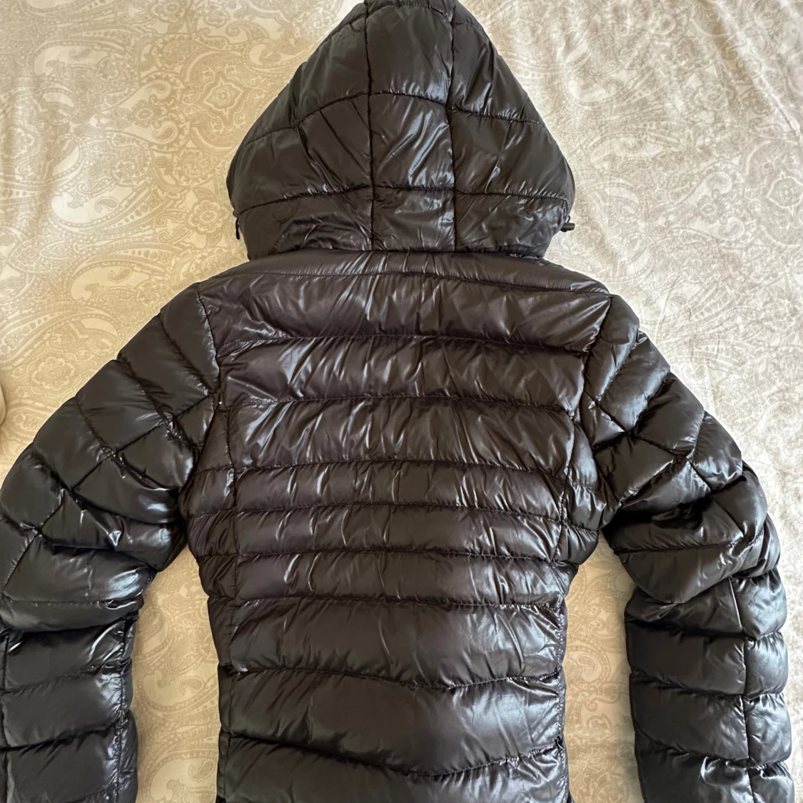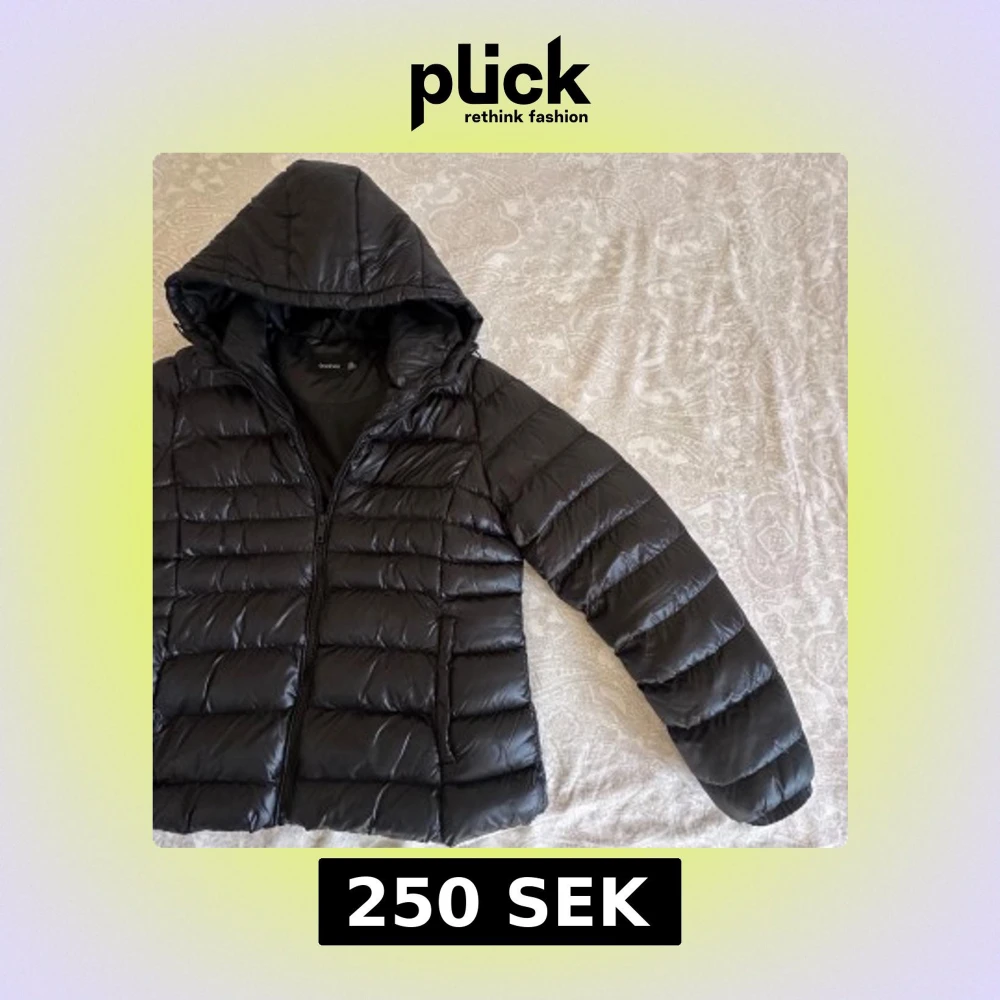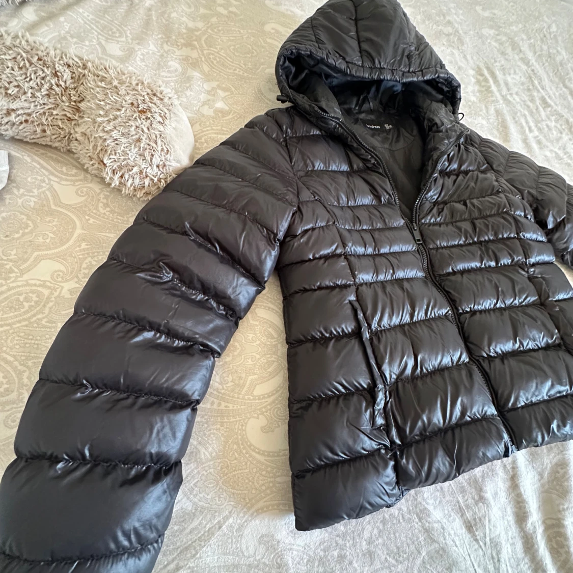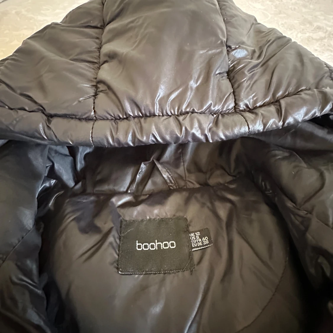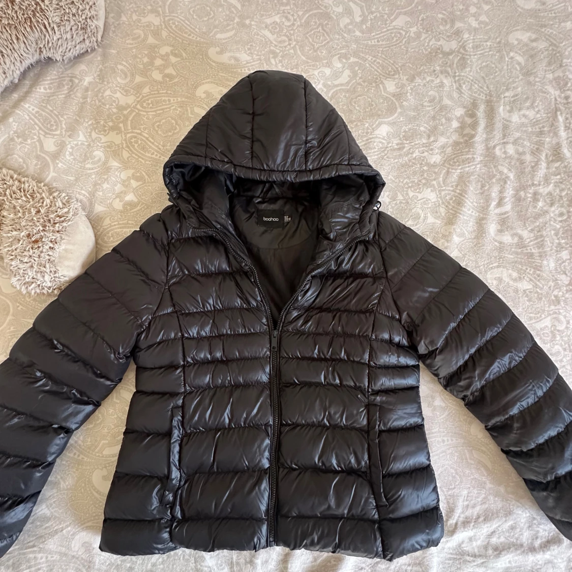 Svart pufferjacka från Boohoo med glansig finish och huva. Jackan har horisontella quiltade partier, dragkedja framtill och långa ärmar. Perfekt för kalla dagar när du vill hålla stilen enkel och clean.