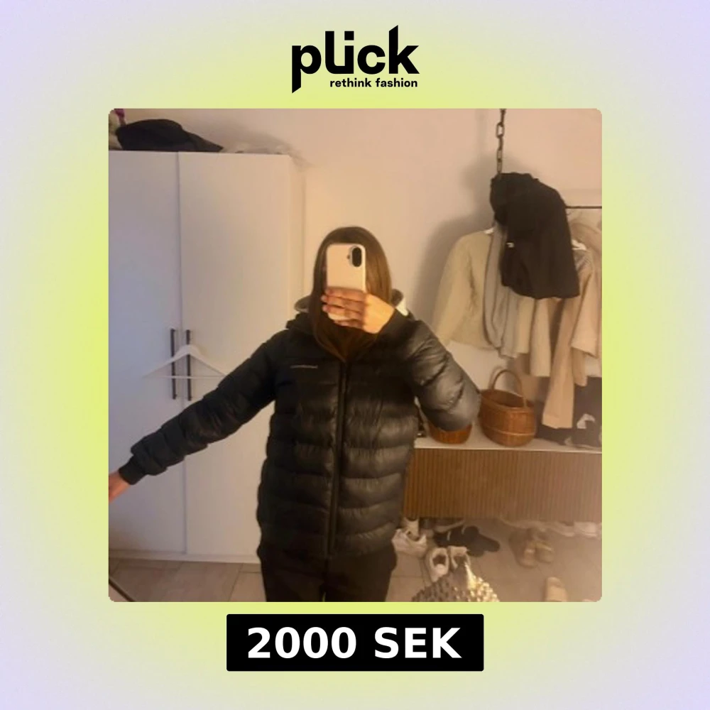 Säljer en svart pufferjacka från Peak Performance med huva och dragkedja framtill. Jackan har en quiltad design och långa ärmar med muddar. Perfekt för dig som vill ha en varm och stilren jacka med clean look.💗