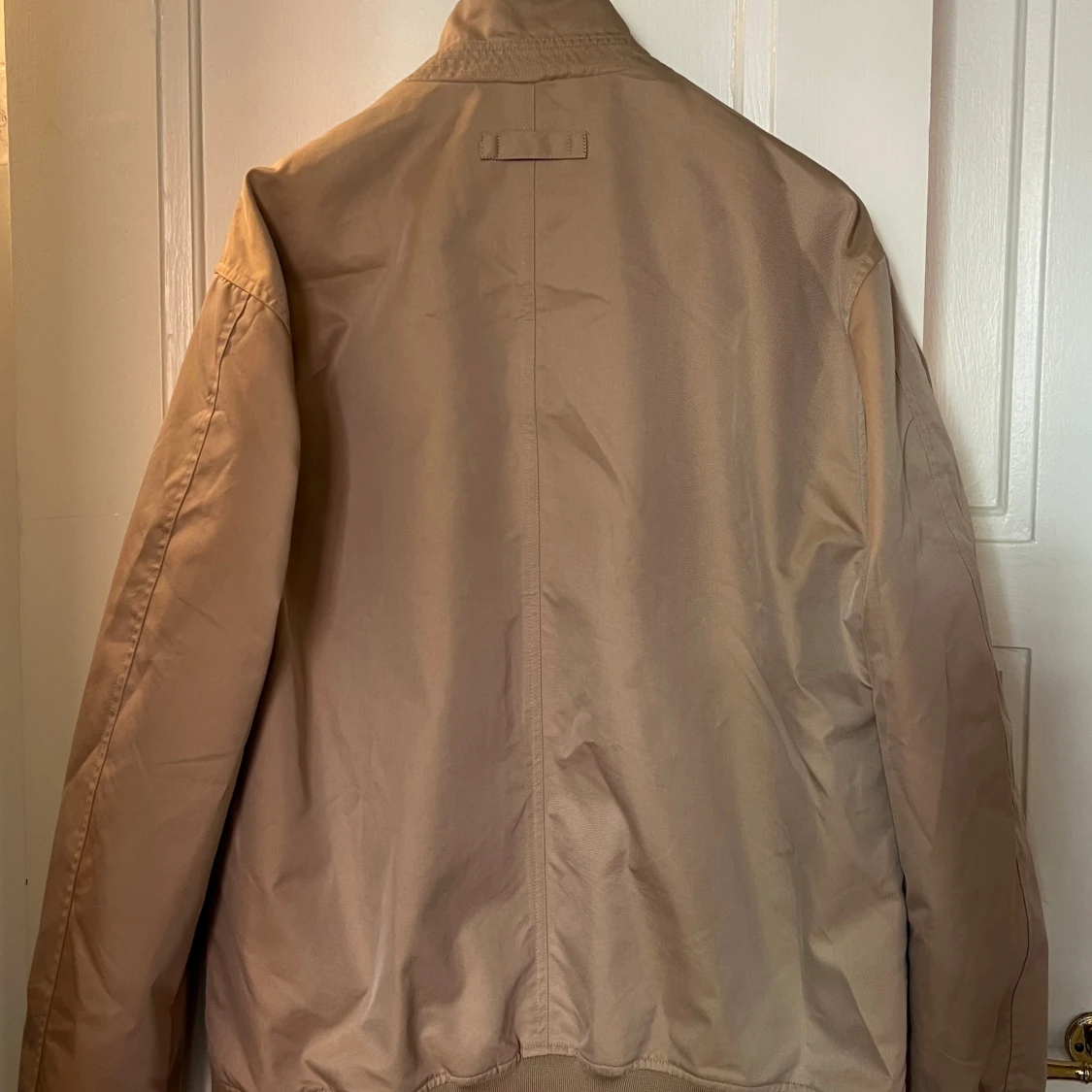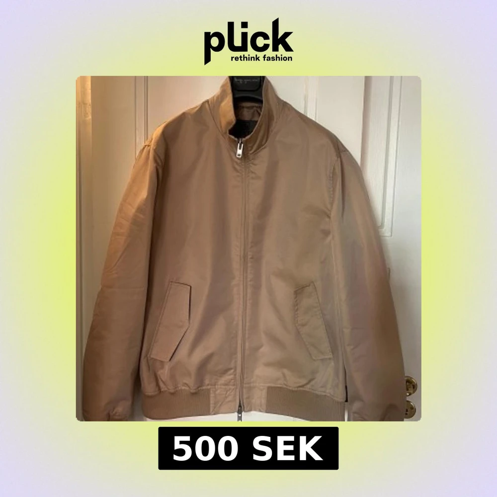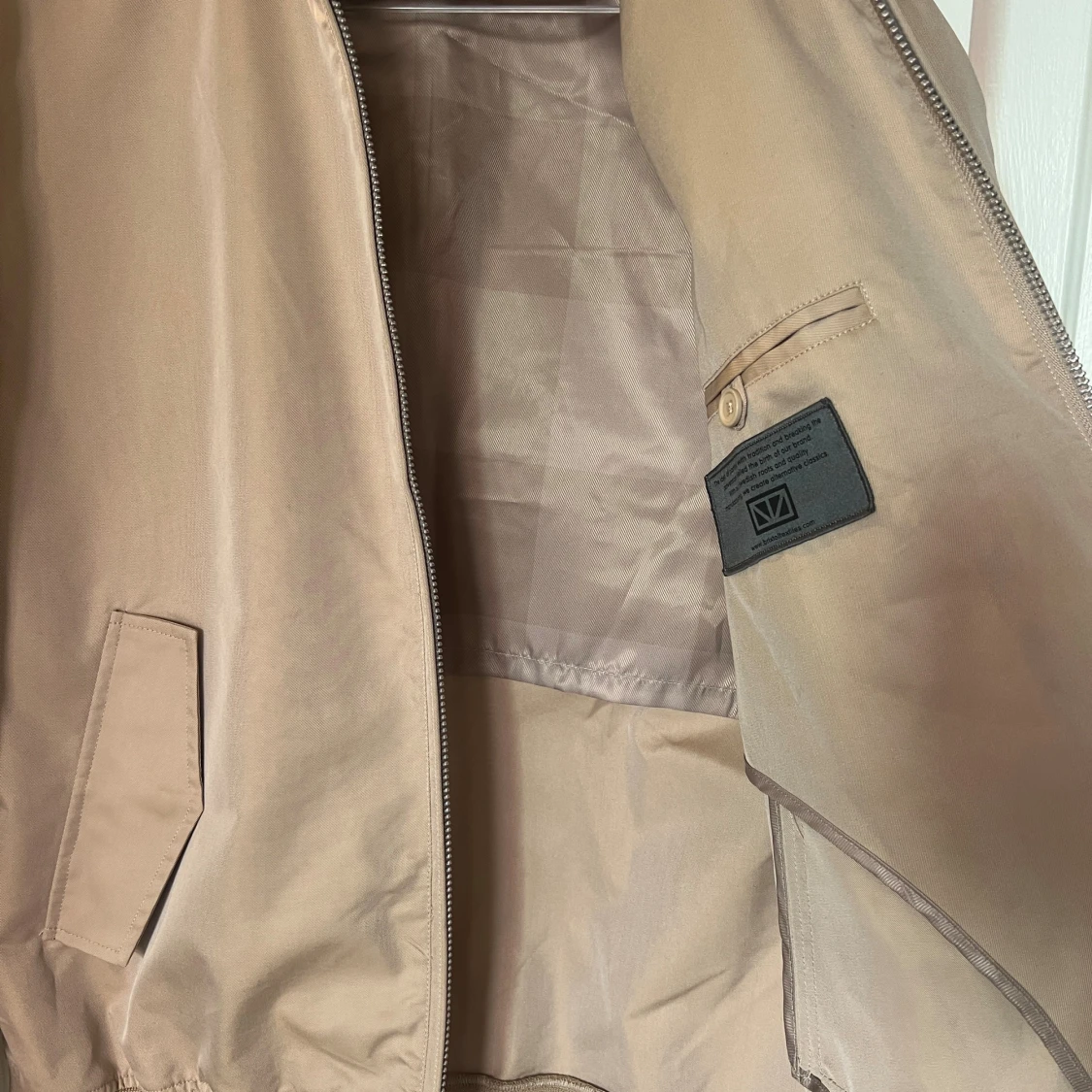 Beige harringtonjacka/baracuta med dragkedja framtill och ribbstickade muddar. Jackan har två fickor fram och en innerficka. Jättefint skick, knappt använd. Storlek: L