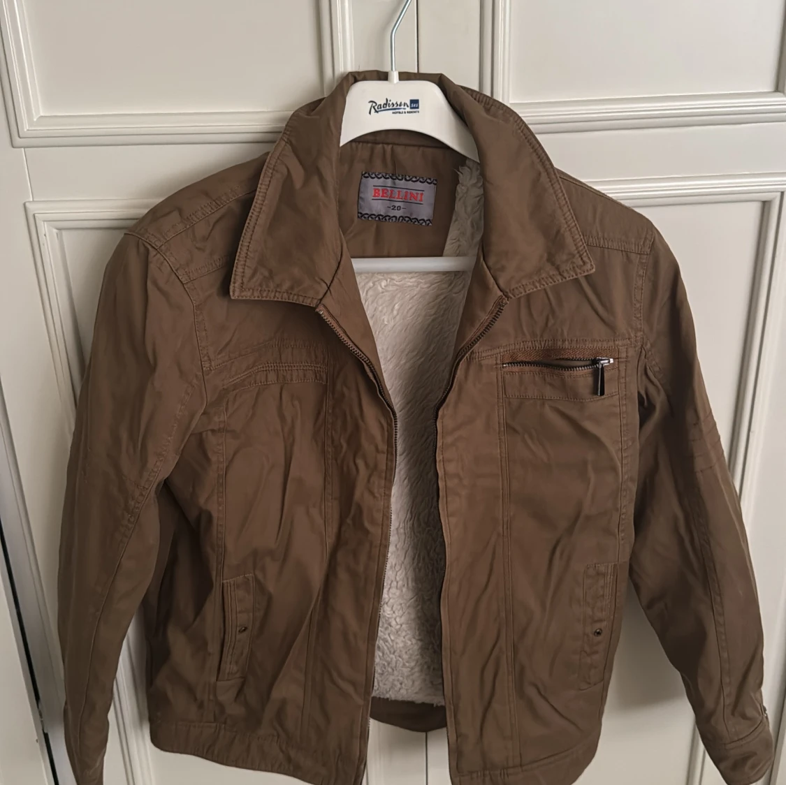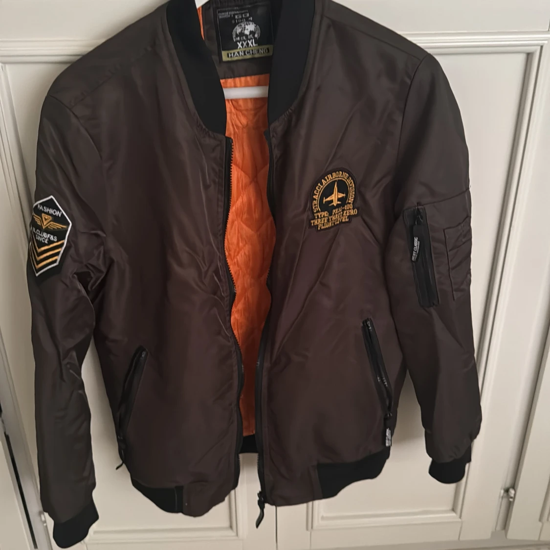 Snygge brun bomberjacka från Han Cheng med orange foder och coola patchar på ärmen och bröstet. Jackan har dragkedja framtill och ribbade muddar vid ärmslut och nederkant. Perfekt för en casual look!