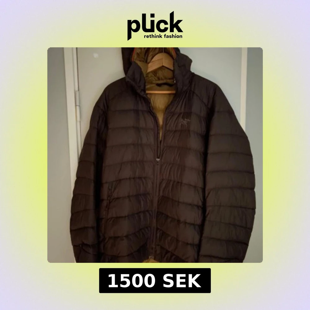Säljer en svart dunjacka från Arc'teryx med huva och dragkedja framtill. Jackan är quiltad och har en lätt oversized passform, perfekt för kalla dagar. Klassisk design med diskret logga på bröstet och praktiska sidofickor.