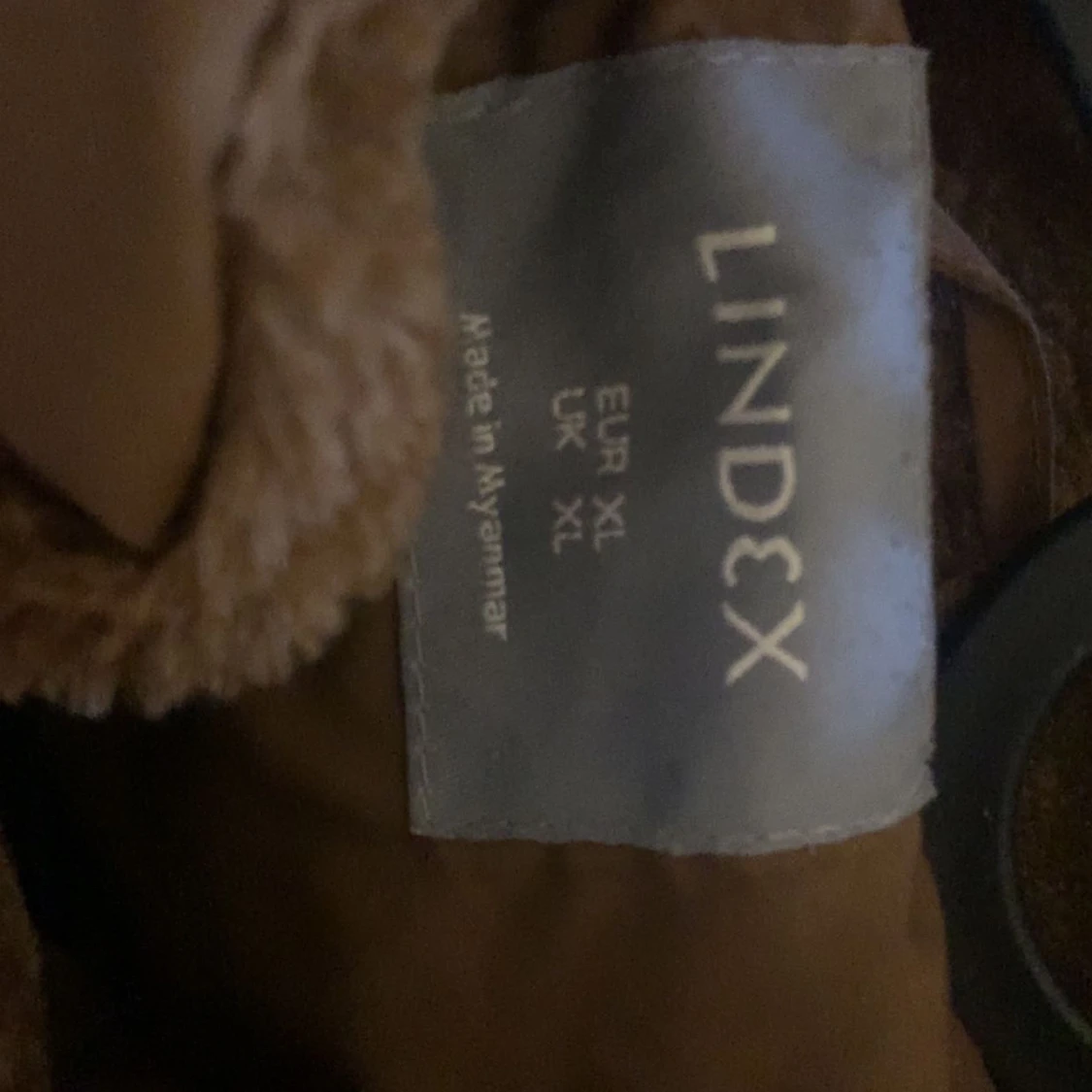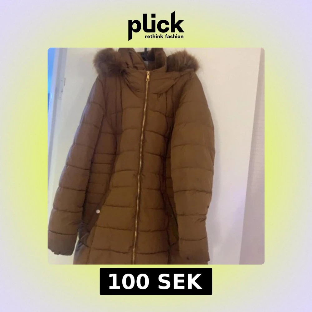 Säljer en brun dunjacka från Lindex med pälskantad huva och dragkedja framtill. Jackan har en quiltad design och långa ärmar, perfekt för kyliga dagar. Den är både stilren och funktionell.