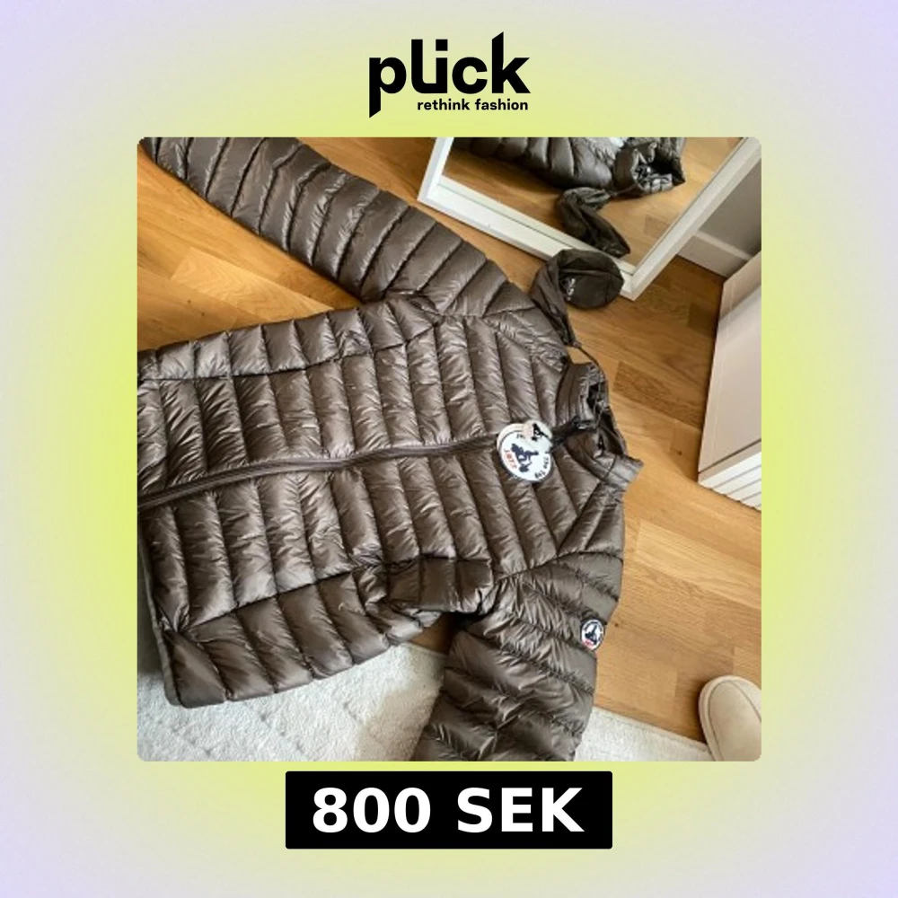 Snygg brun dunjacka från JOTT med horisontella sömmar och dragkedja framtill. Jackan har huva och klassisk logga på ärmen. Perfekt för kyliga dagar och lätt att packa ner i medföljande påse. Aldrig använd