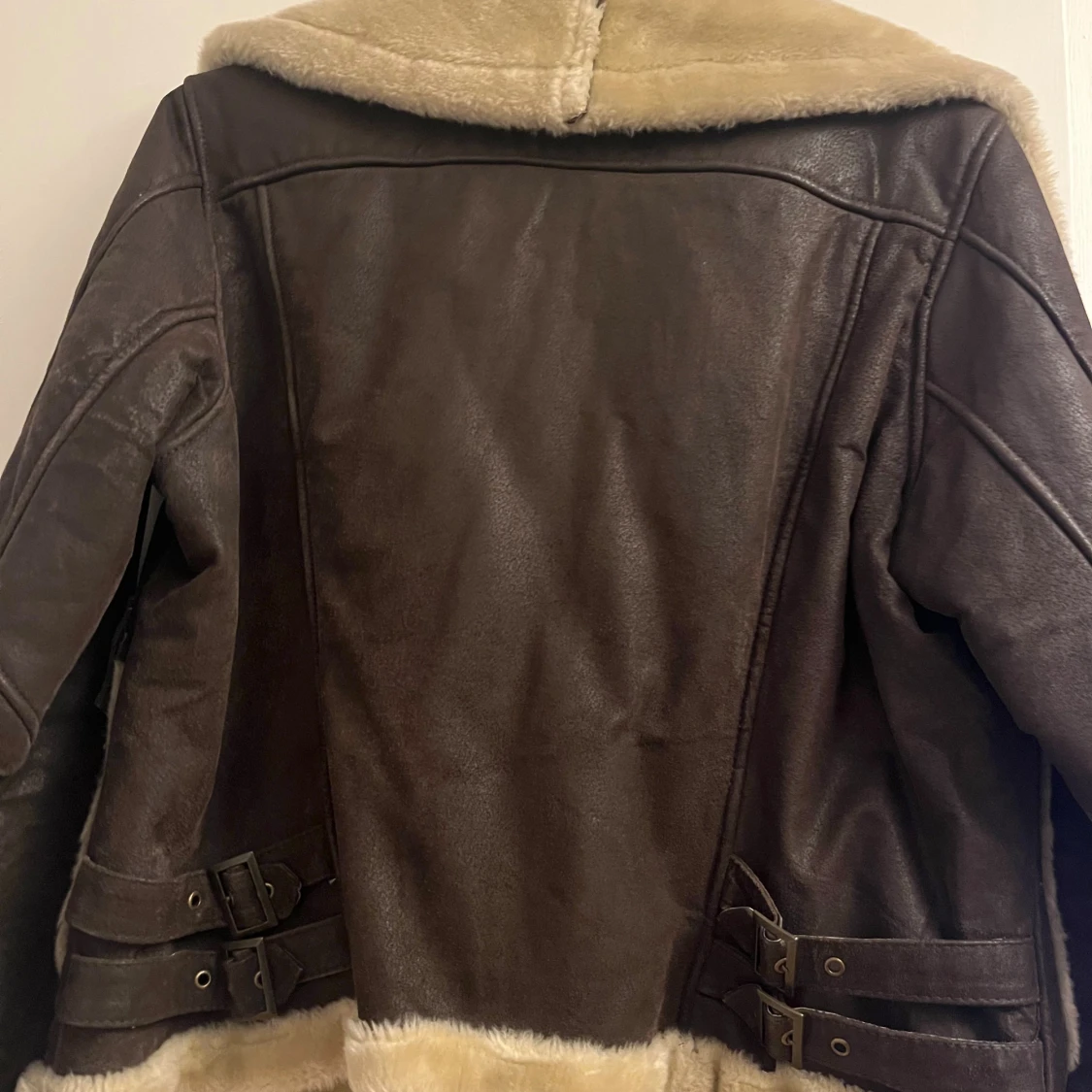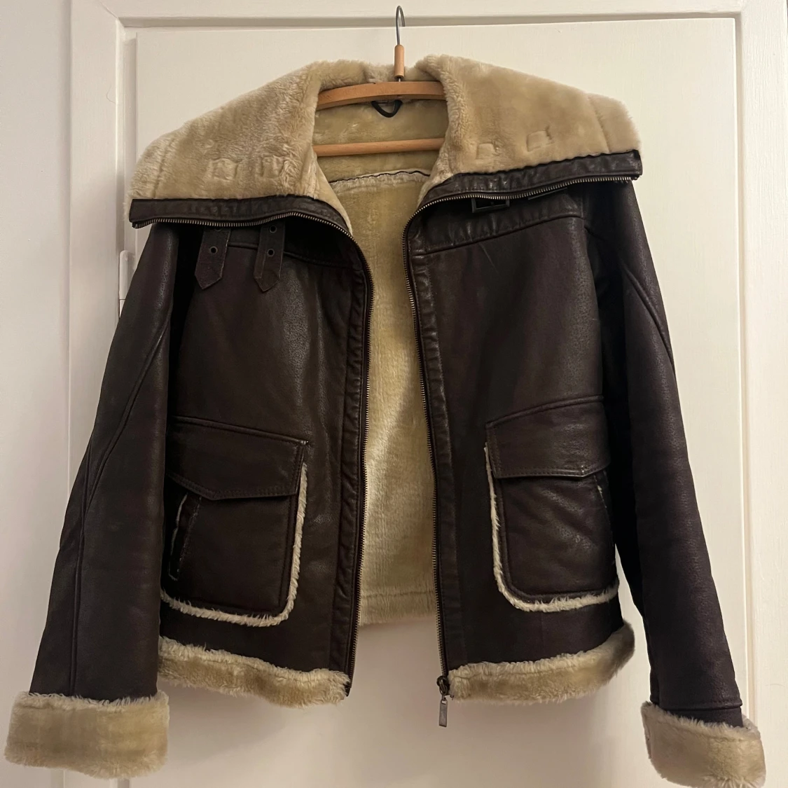 Säljer en brun läderjacka med mjukt offwhite foder och krage. Jackan har två stora fickor framtill, dragkedja och snygga spänndetaljer på sidorna. Perfekt höst/vinter-jacka i mycket fint skick!🍁obs står ej storlek men skulle tro s-m!
