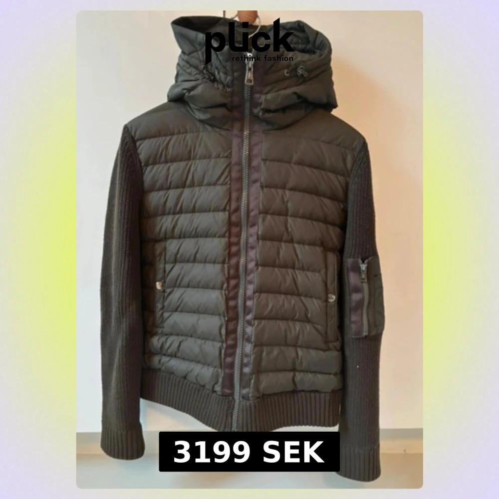 Snygg mörkgrön pufferjacka från Moncler med stickade ärmar och quiltad kropp. Jackan har huva med snörning, tvåvägsdragkedja och ficka med dragkedja på ärmen. Materialmix av polyester och stickad ull ger en cool look. Moncler-logga på ärmen. Lappen inne i jackan är sönder som ja visar på en av bilderna men är annars i väldigt bra skick inga tecken på användning.