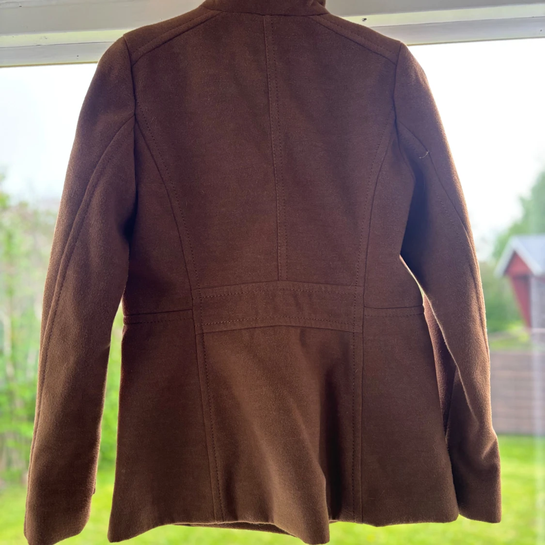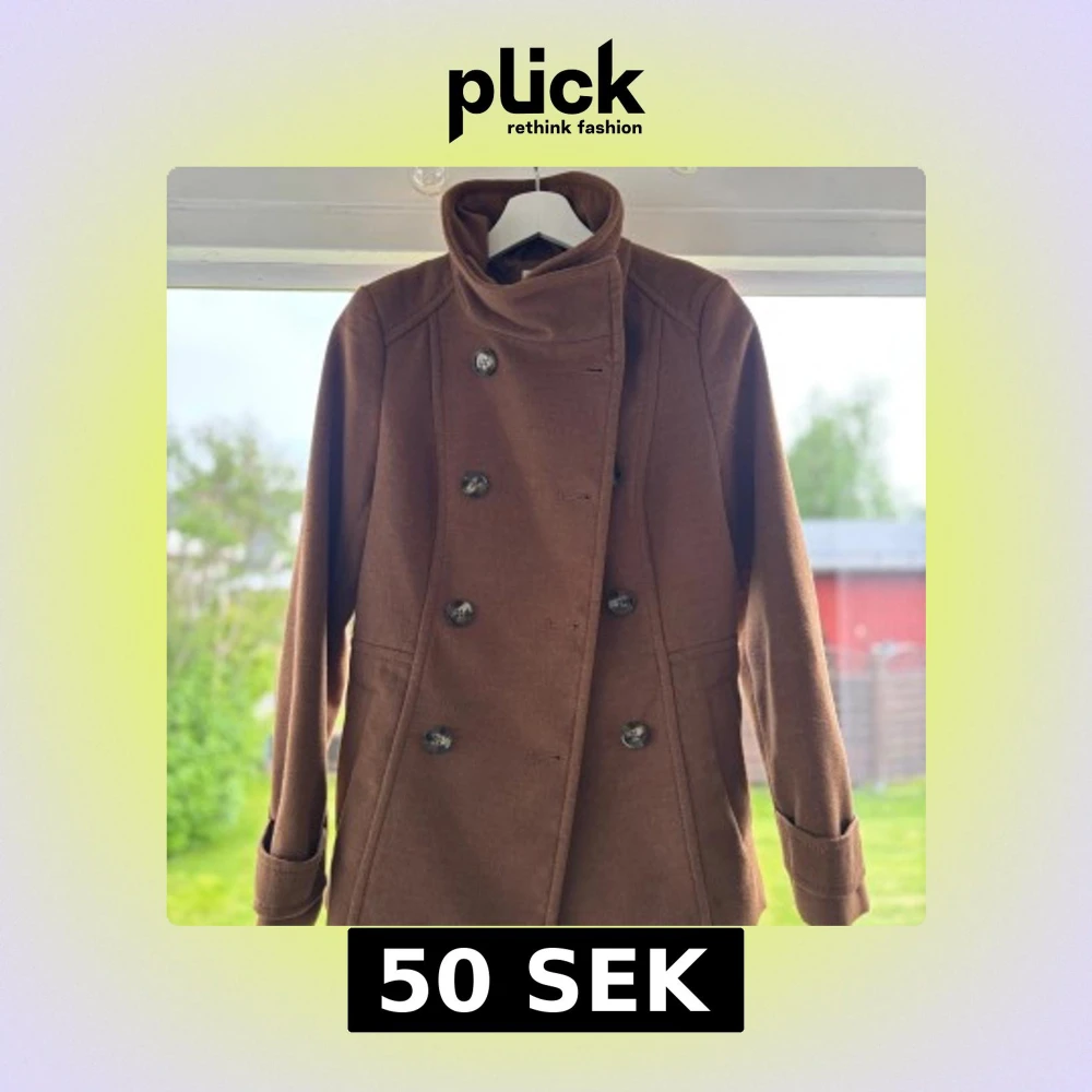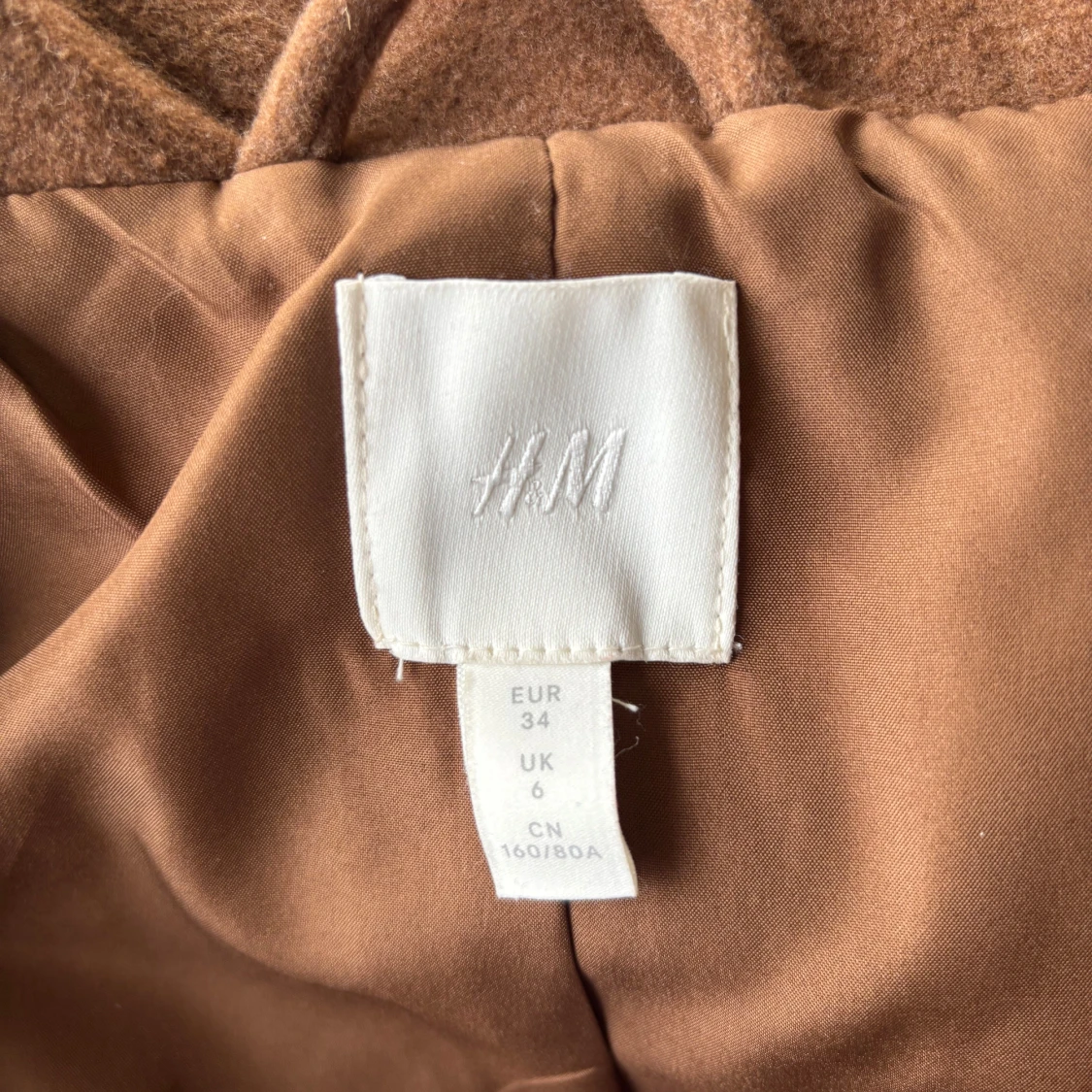 Snygg brun skepparkavaj från H&M i klassisk modell med dubbelknäppning och hög krage. Jackan har långa ärmar och markerad midja för en stilren siluett. Perfekt för dig som vill ha en tidlös look med lite edge.