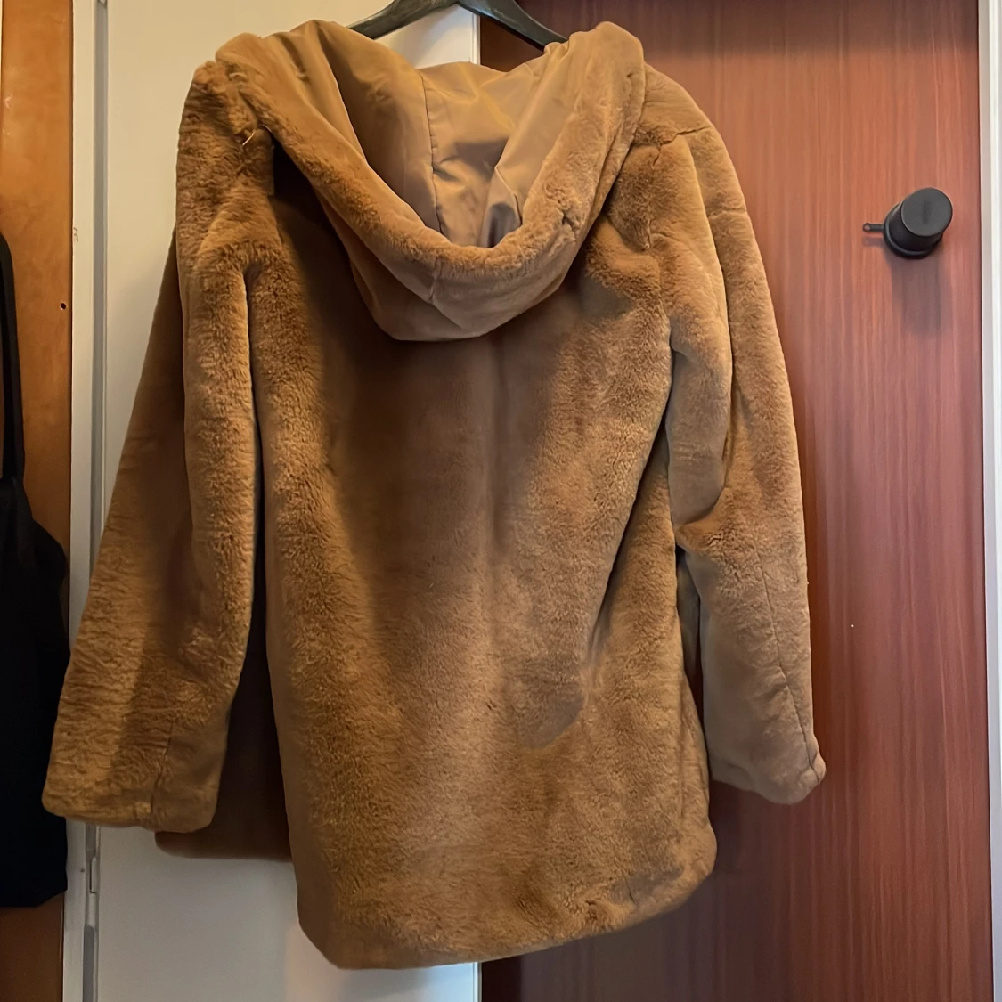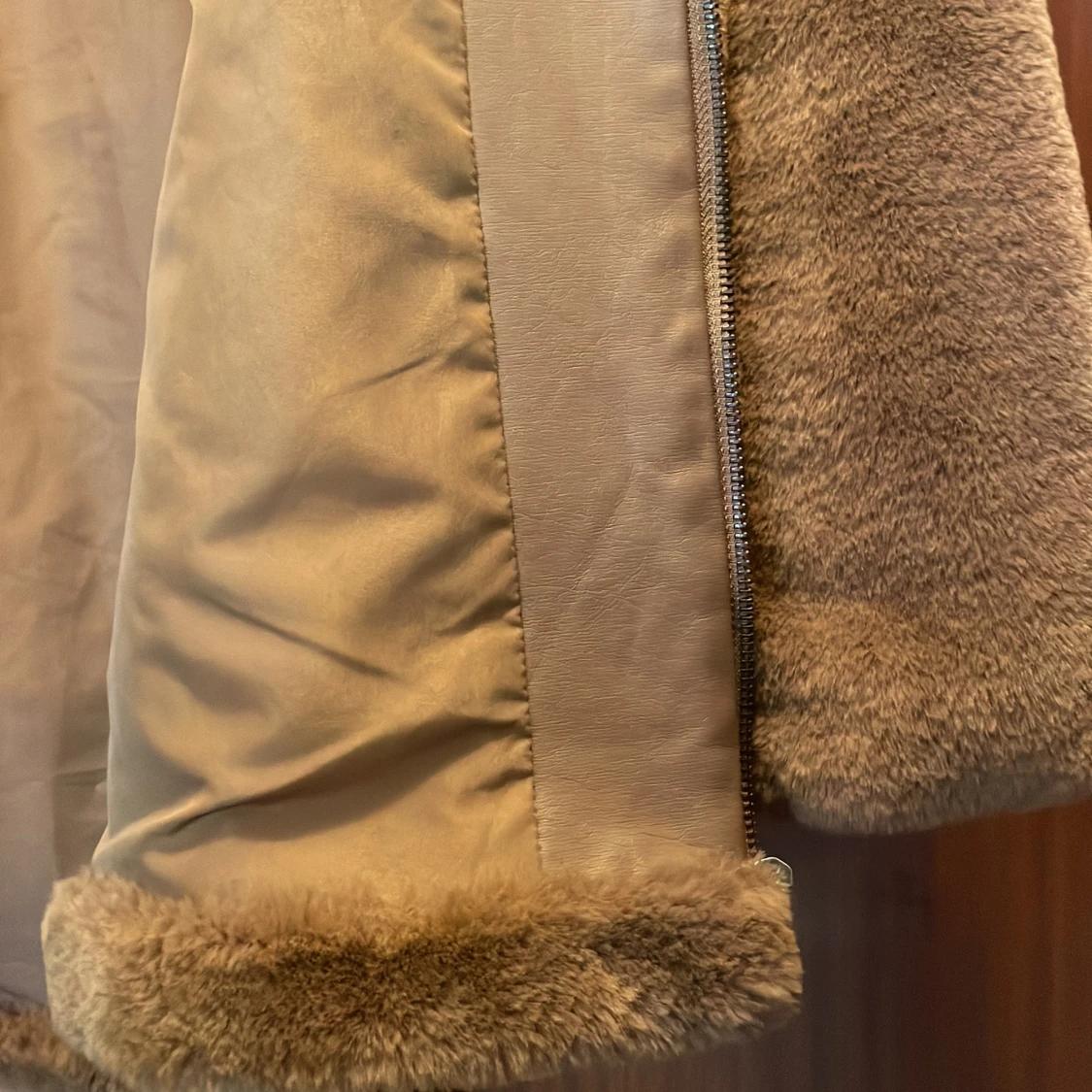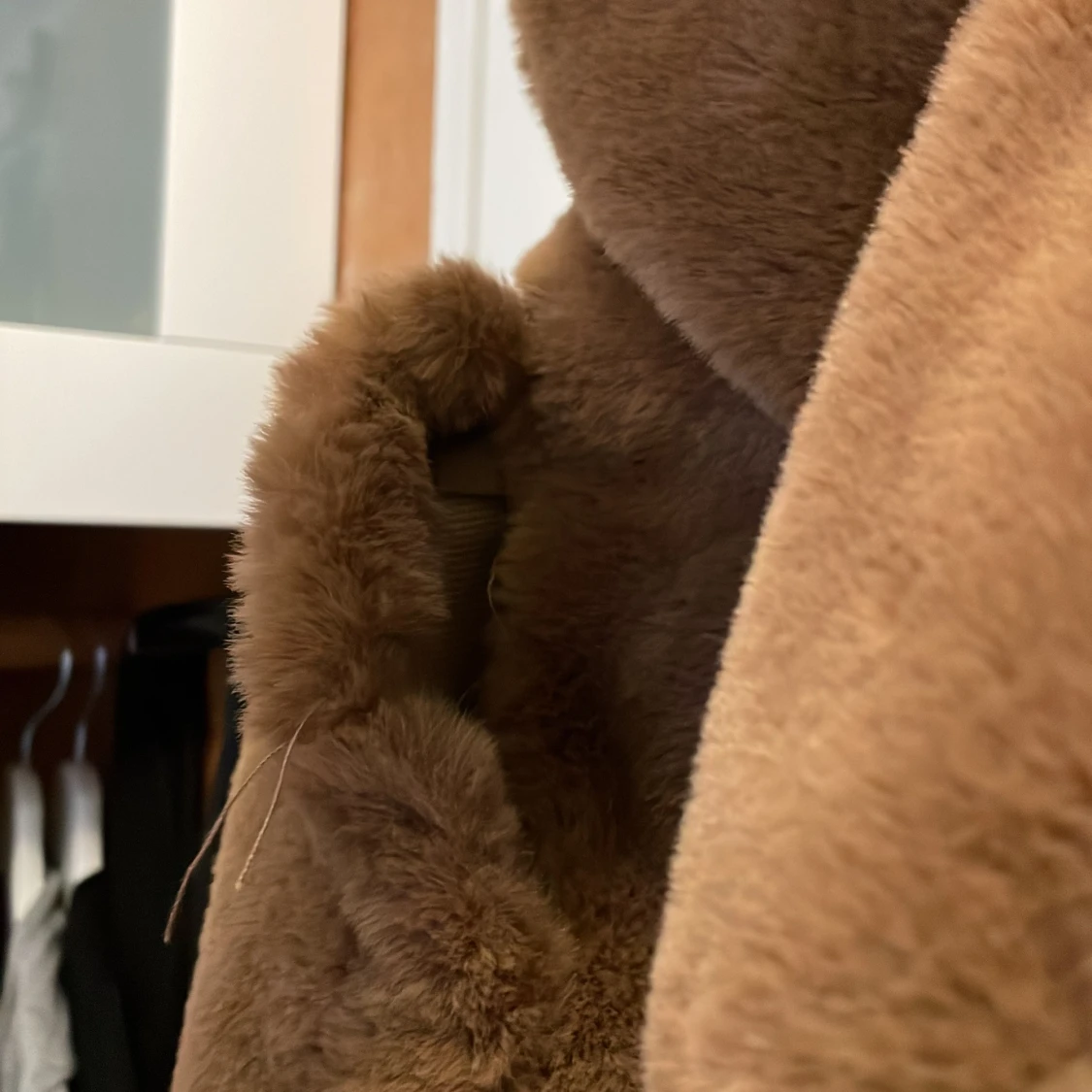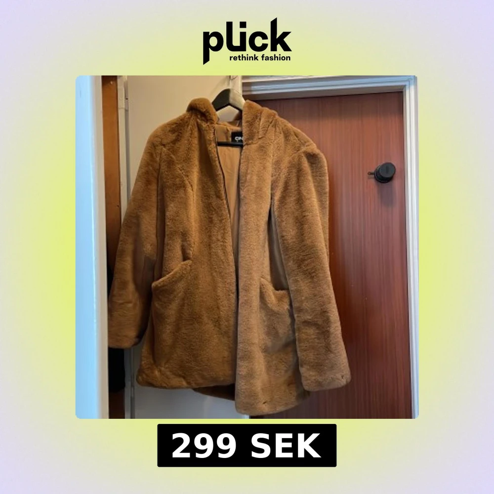 Mysig brun teddyjacka från Only med huva och två stora fickor framtill. Har endast använt jackan vid två tillfällen och vid ett av dessa tillfällen råkade jag ta sönder jackan så att det är ett litet hål ungefär under luvan (bild nr 4) som går att sy med några stygn men annars är jackan i nyskick.