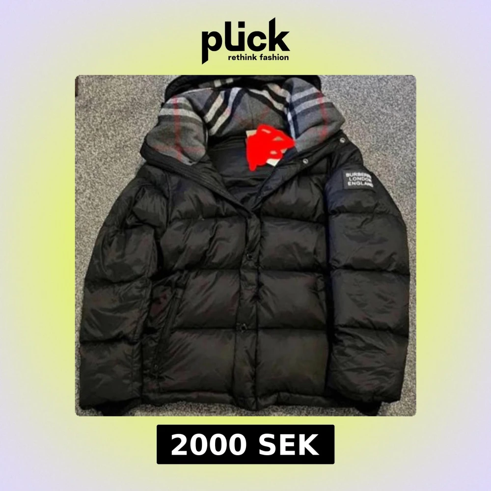Snygg svart dunjacka från Burberry med klassiskt rutigt foder i huvan. Jackan har en puffig siluett, dragkedja och knappar framtill samt Burberry-logga på ärmen. Perfekt för kalla dagar när du vill hålla stilen.